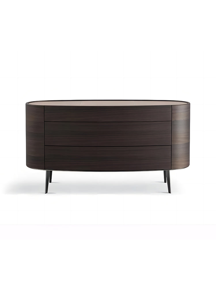 description | Oval bedside table with drawers. Supported by a wooden structure with curved and delicate lines, Kelly stands out for the unique covering of its base perimeter and the sinuous, enveloping design of its headboard. The project is completed with a bedside table with drawer and a metal structure. |