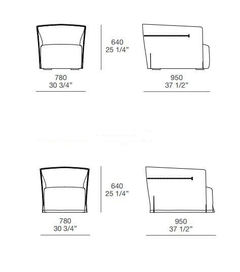 description | Structure and seat in flexible moulded polyurethane with inserts in polyurethane in different densities. Feet:slides in plastic or rotating base (only for the armchair). Pre-covering: parts with goose feathers inside and parts in polyester padding. Final stretched covering removable in fabric (except velvet). Version with slipcover removable in fabric (except velvet). Stitch: double normal or drawstring stitch with thread in 10 colours of sample book. Trims: grosgrain in 10 colours of sample book (excluded leather and velvet coverings). |
