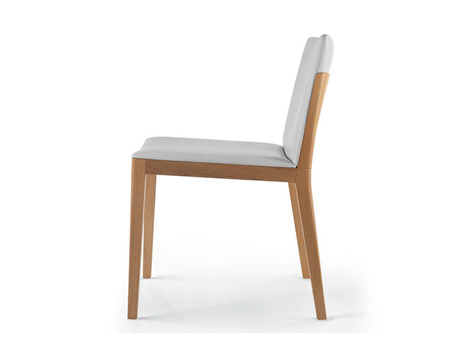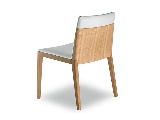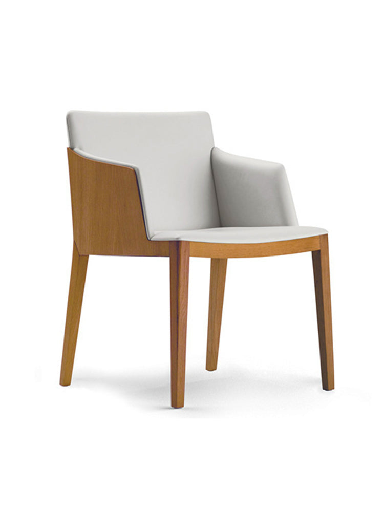 description | Sensations of poise and harmony and a well-tempered design free from overdominating elements. The alternation between leather and wood creates measured graphic effects, especially behind the backrest, where a curved wooden panel is grafted elegantly into the rear legs. The frame is made entirely from solid oak, with the back panel in curved multilayer beech and an oak veneer. Seat springs are made with elastic webbing and the padding is in polyurethane foam. It is upholstered with invisible stitching in Pelle Frau® leather. Chrome-finished steel structure. |