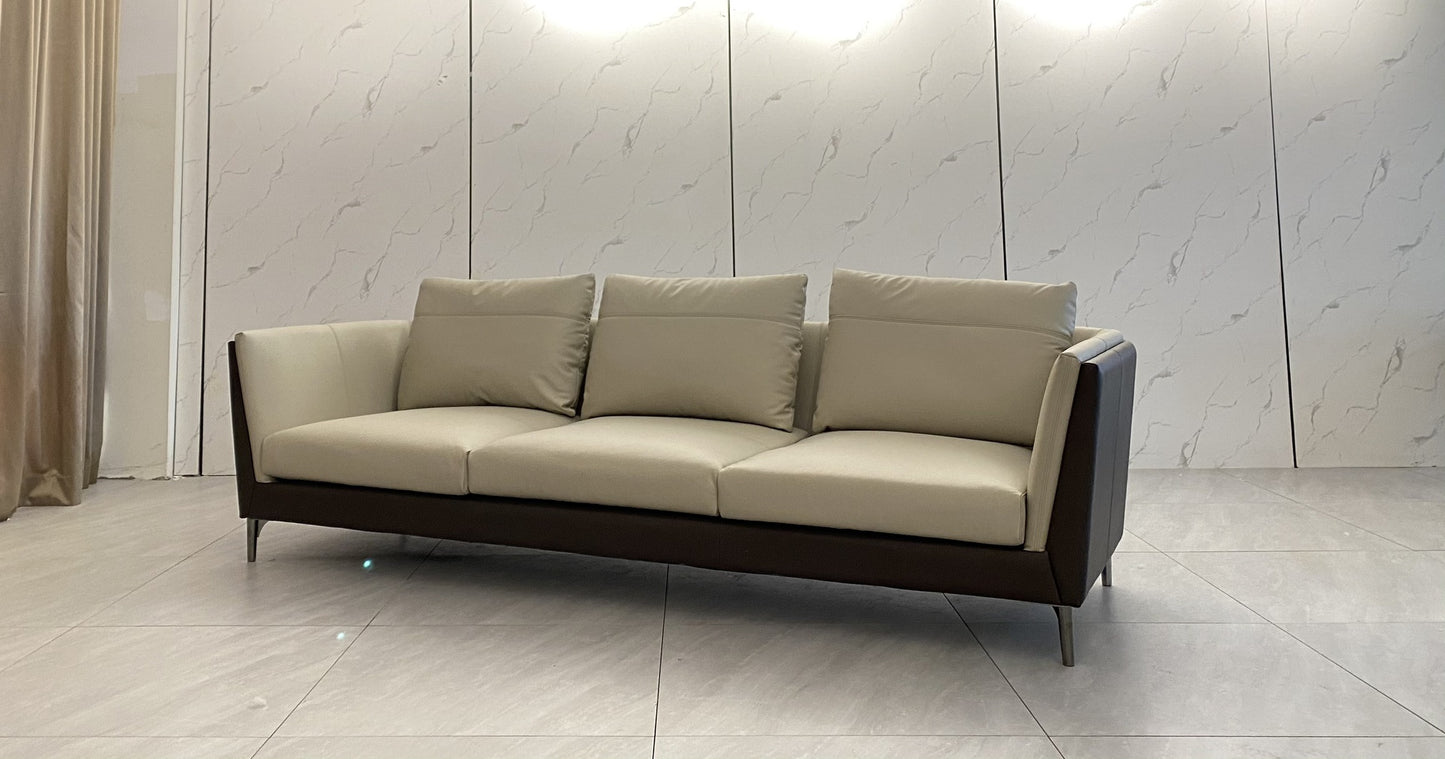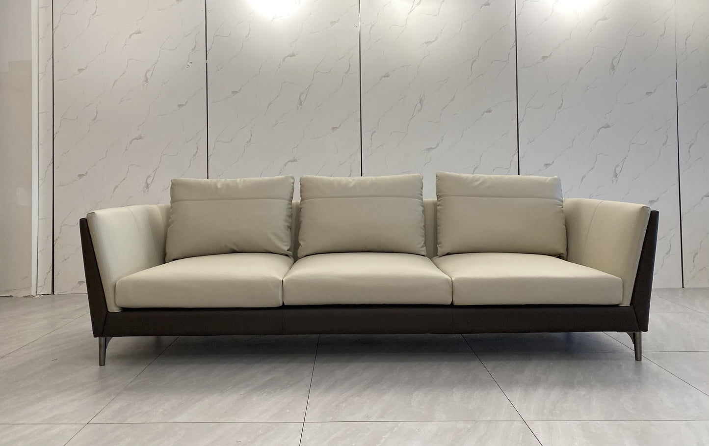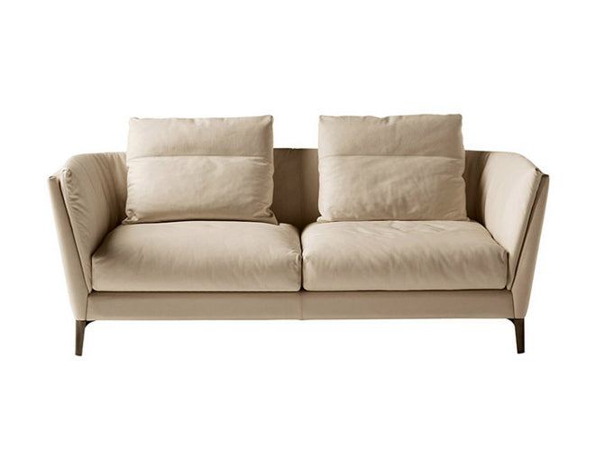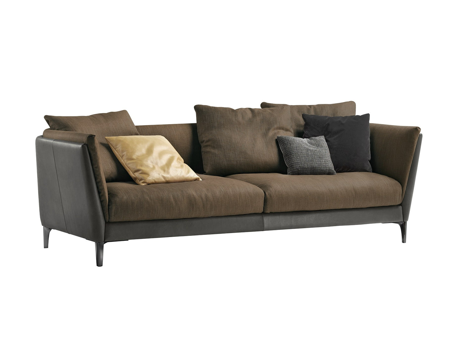 description | The Bretagne sofa offers new and elegant decorative combinations of different materials. The numerous welcoming seat cushions come in a new version with removable fabric cover, emphasising their softness and comfort. Combined with the frame upholstered in Pelle Frau® leather, the overall effect is one of great visual and tactile warmth. A slender steel profile with gunmetal grey finish traces an understated decoration on the back, at the junction between the armrest and backrest. The base is in seasoned poplar and beech wood. The backrest and armrests are in birch plywood with polyurethane foam padding and polyester wadding. The springs of the seat take the form of elastic straps and it is padded with polyurethane foam and pressed felt. The seat and backrest cushions are padded with goose down with a stabilising polyurethane foam insert. Aluminium feet with gunmetal grey finish. |
