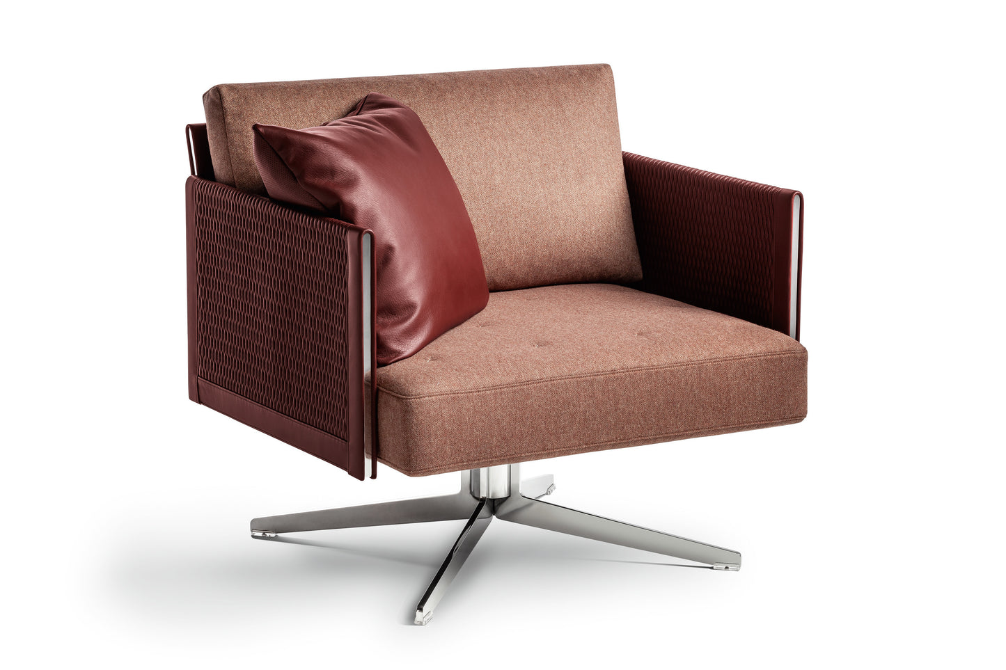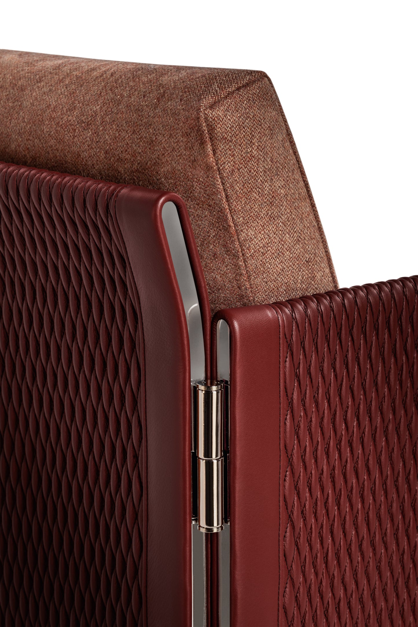 description | Jean-Marie Massaud interprets the Clayton sofa as a sophisticated haute couture creation. Sumptuous yet radically modern, architectural and enveloping just like an haute couture dress. Luxurious stitching, worthy of the finest tailors, runs right along the outside edge of the Pelle Frau® leather-upholstered backrest and armrests to create a sophisticated 3D effect. The seat cushions are embellished with delicate x-shaped stitches applied by hand with contrasting thread - a subtle reference to the distinctive hallmark of Jean-Marie Massaud's furniture for Poltrona Frau. A highly decorative web of hand-braided saddle leather straps supports and secures the seat springs. The architecture of the sofa is clear and light. The seat rises from the floor on steel feet with Ruthenium finish. The version of the Clayton that combines leather with fabric or velvet for the cushion covers guarantees a particularly rich sensory experience. The backrest and armrest panels, in steel with light polyurethane foam padding, are connected by exposed metal hinges in a Ruthenium finish. Goose down is used for the soft padding of the armrest and backrest cushions. Clayton is available in a version entirely upholstered in Pelle Frau® leather or in combination with the wide range of Poltrona Frau fabrics. |