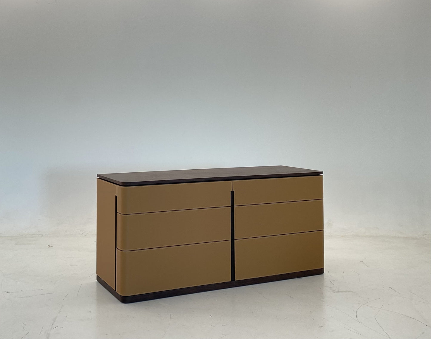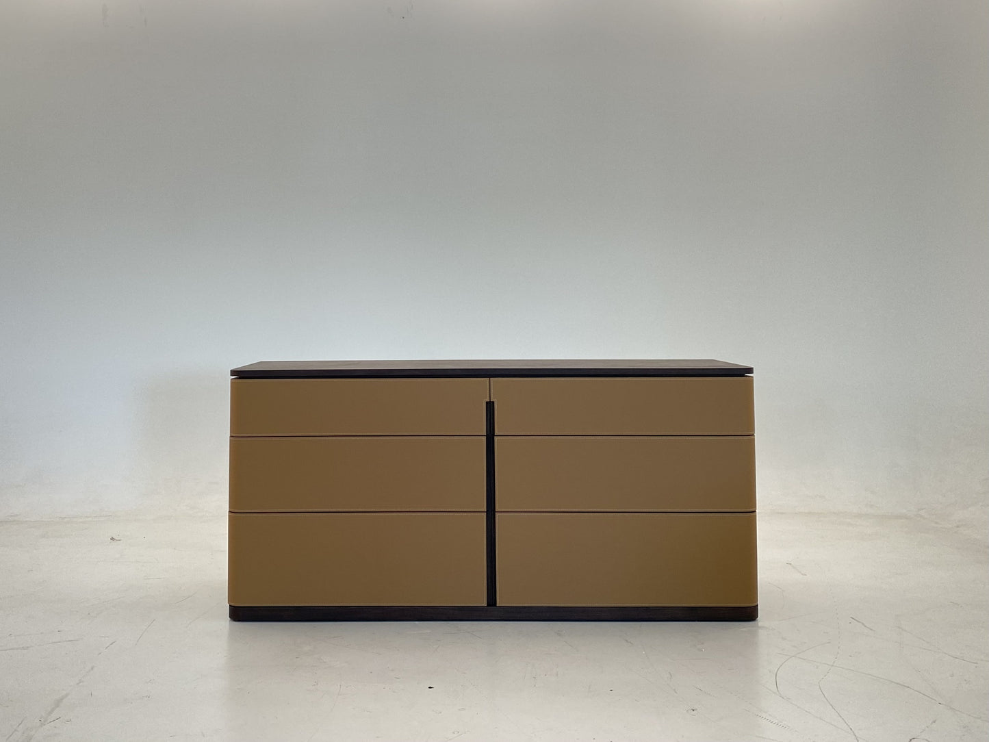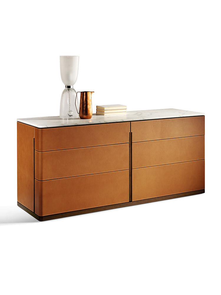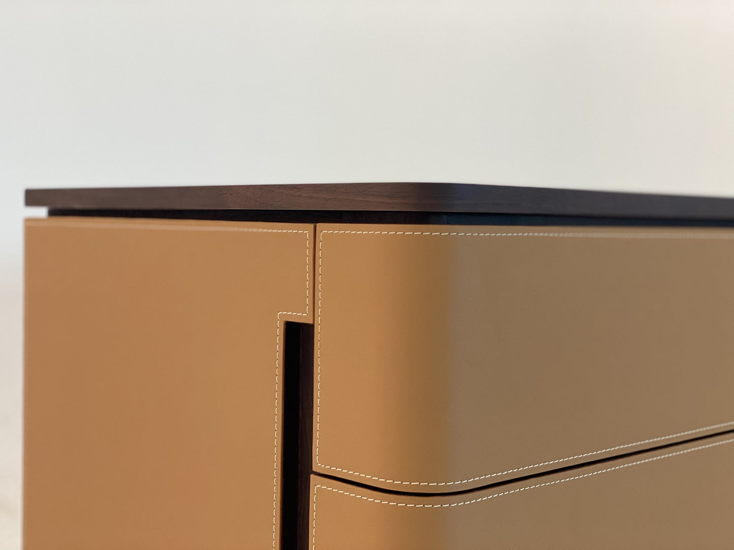 description | Fidelio Notte: chest of drawers, tall boy and bedside table for the bedroom. As with the rest of the Fidelio series, the designs are clean and the materials fine. Roberto Lazzeroni uses functional details to create highly distinctive aesthetic elements, like the recessed handles on the surfaces. There is also an intense contrast between the warm, dark tones of the saddle-leather and wood of the exteriors, and the luminous explosion of the natural maple that reveals itself in the drawers. |