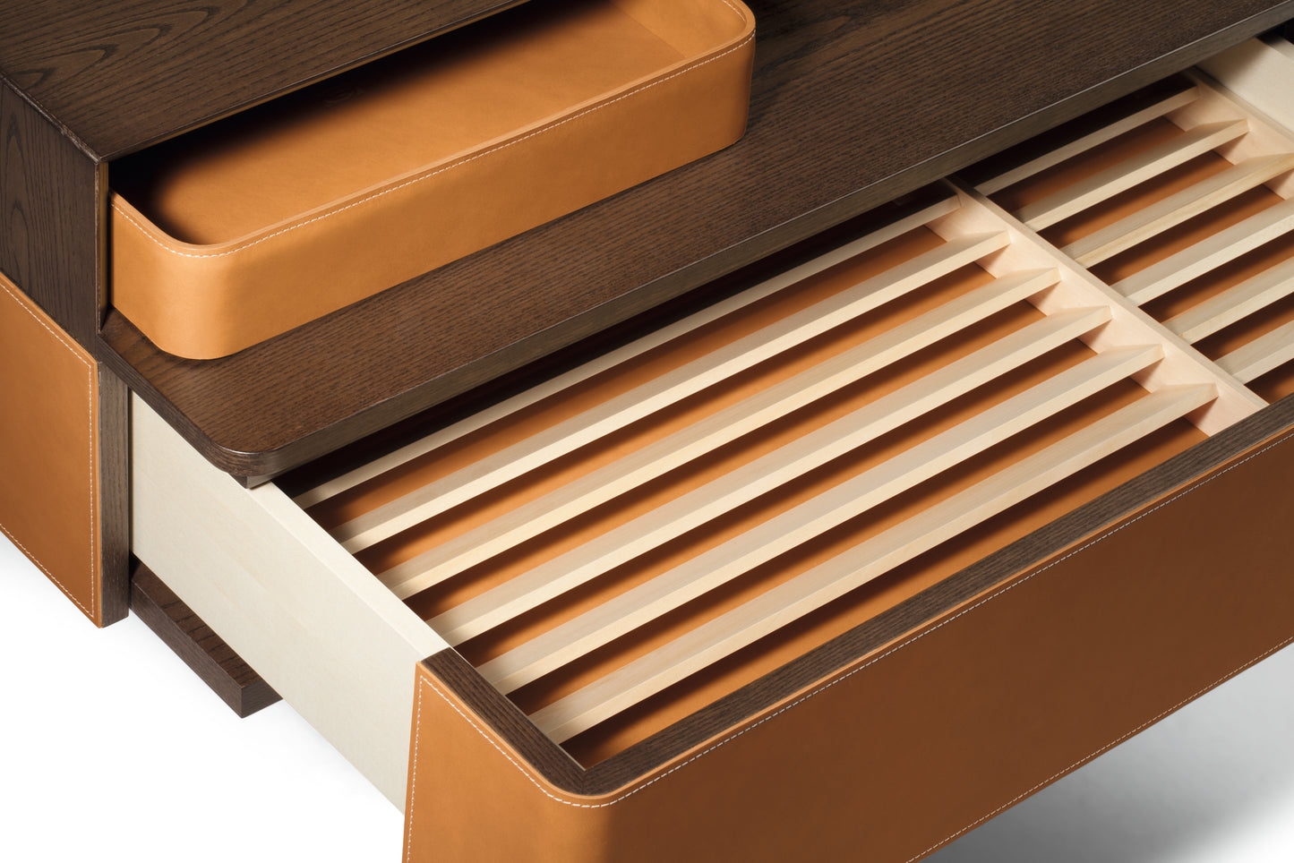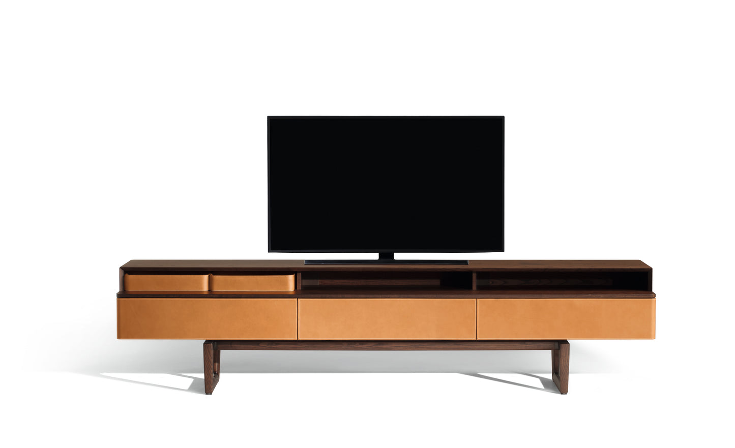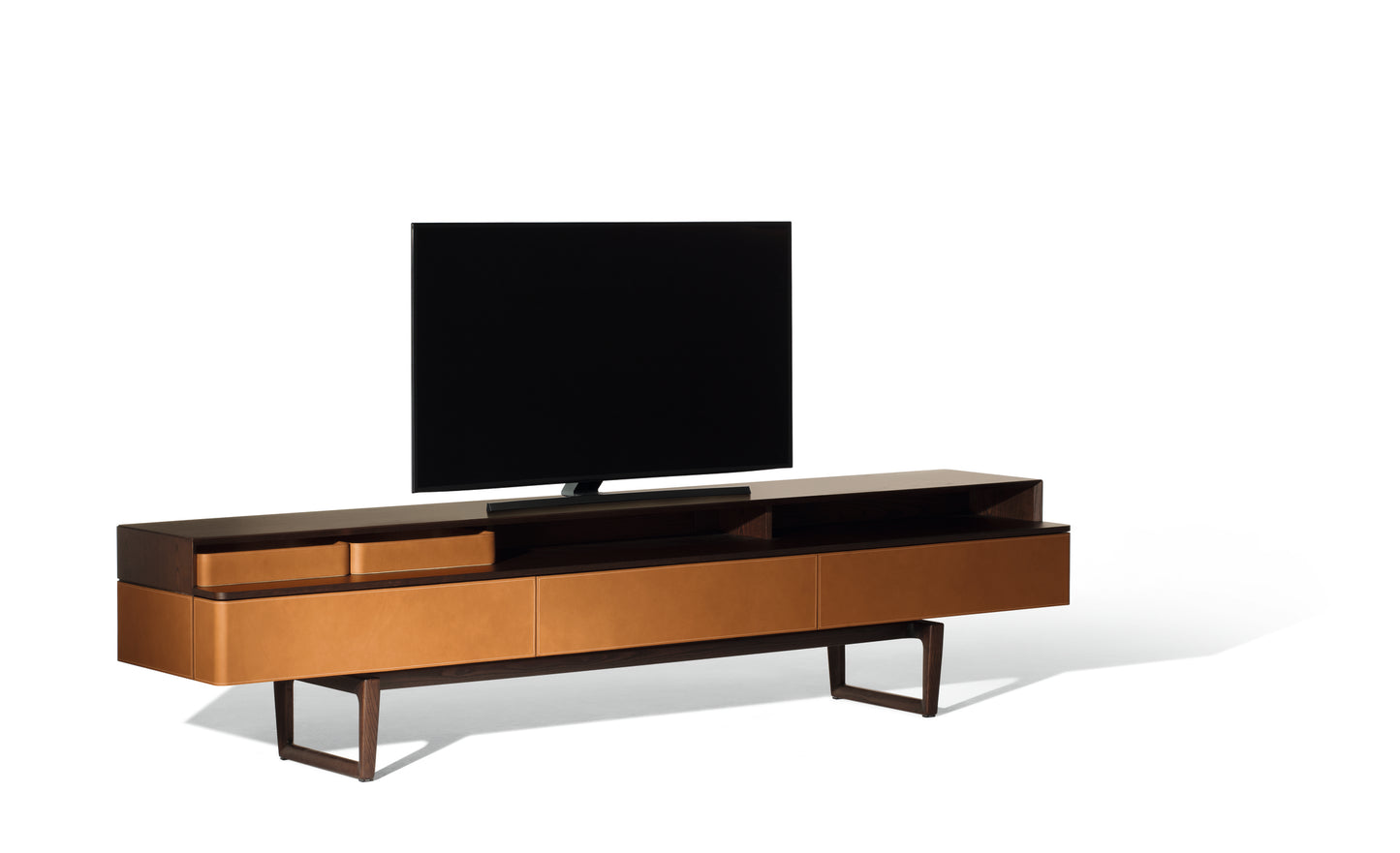 description | Roberto Lazzeroni enriches the series of Fidelio storage units with the new Fidelio Multimedia Cabinet. A versatile accessory, ideal for housing the TV and stereo in the living room, which revisits the aesthetics of the collection. Clean lines, warm and natural materials like saddle-leather and wood, fine finishes, perfectly calibrated and extremely light volumes. |