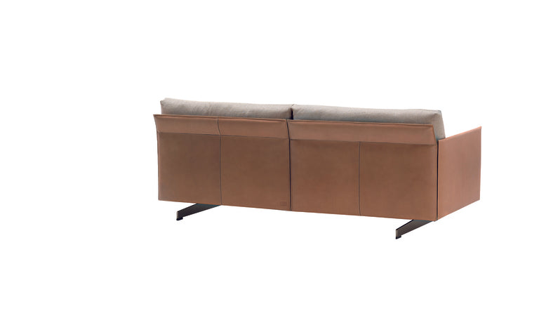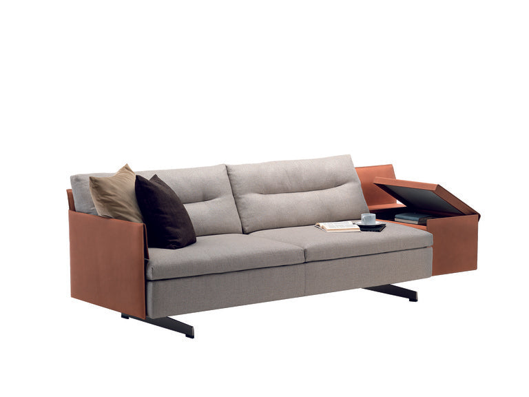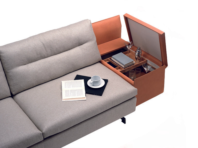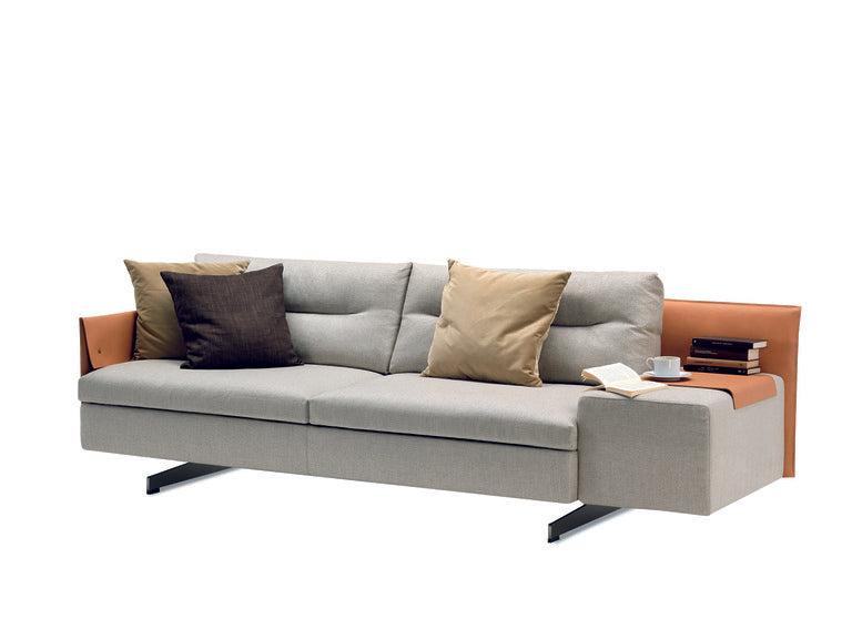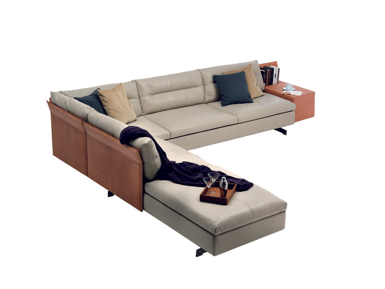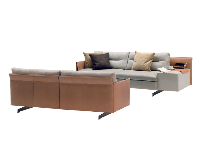 description | The world of saddlery, a realm of luxury craftsmanship and expert processing, is Jean-Marie Massaud’s inspiration for GranTorino, a system of modular sofas which, in its most original and precious version, pairs saddle-leather with Pelle Frau® leather or fabric. The saddle-leather, cut and moulded by hand, closely follows the lines and geometries of the seating. Precision and complex workmanship also for the slim high armrest and the low armrest, also available with a little compartment that houses an elegant natural oak tray. |