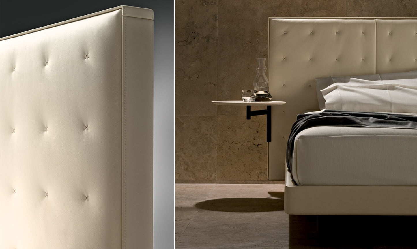 description | The Jack bed, designed by Jean-Marie Massaud, has the authority and character of a product that defines a space. The headboard is superbly rigorous, embellished by a light and delicate hand-stitched X motif that epitomises the expert craftsmanship typically associated with Poltrona Frau. Jack can be enriched with two bedside surfaces, upholstered like the bed. |