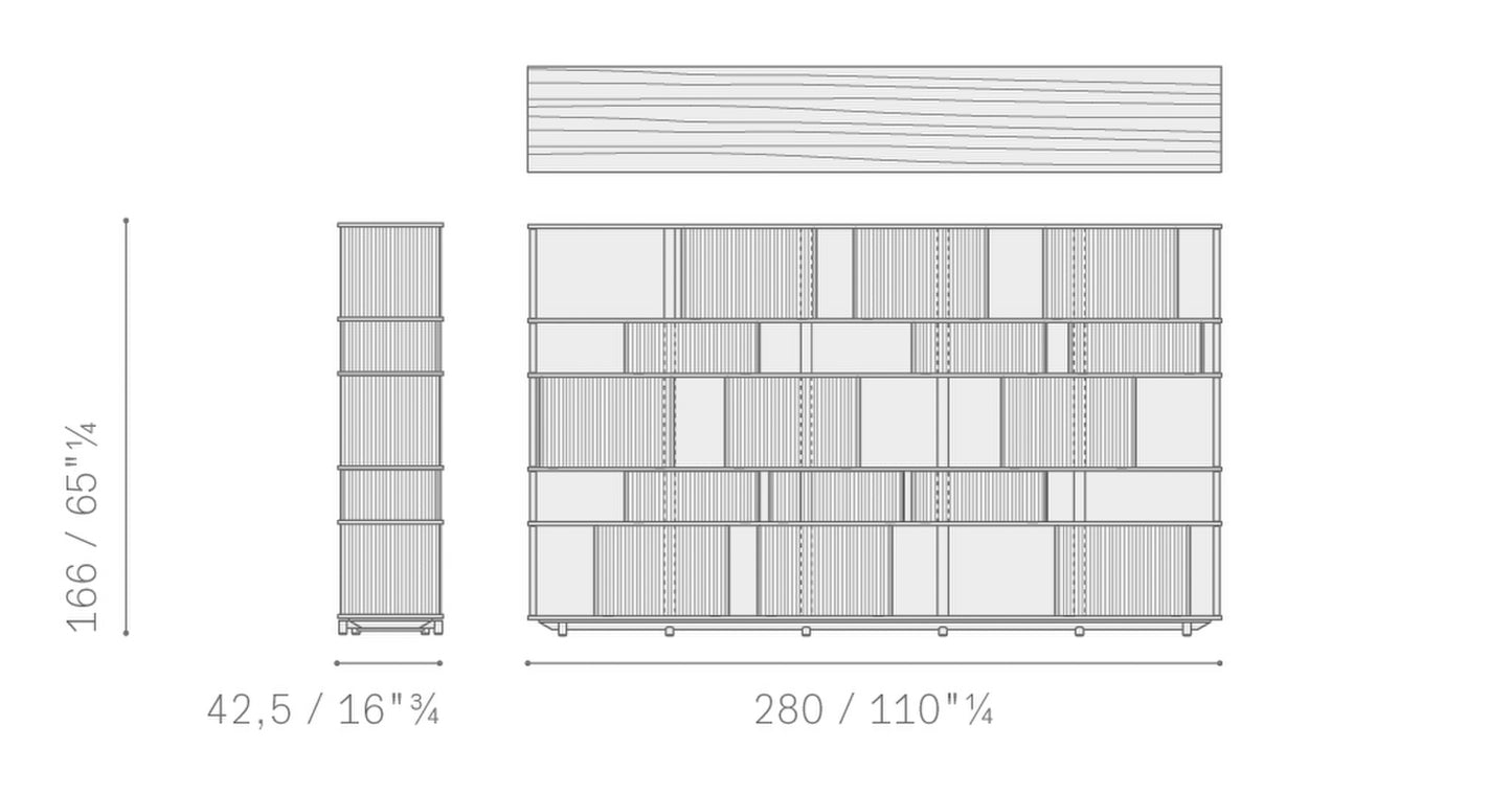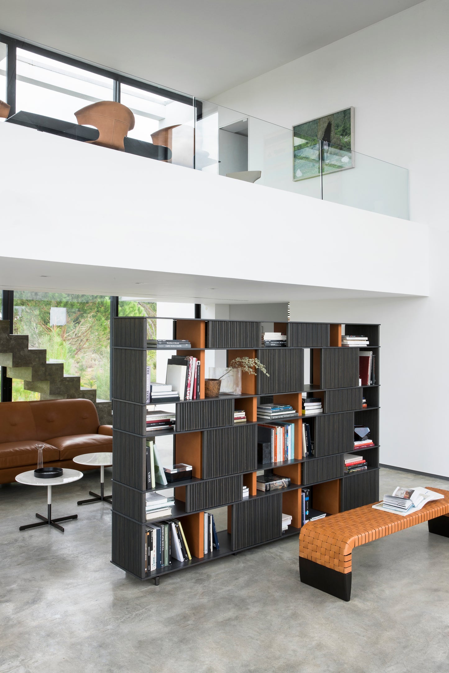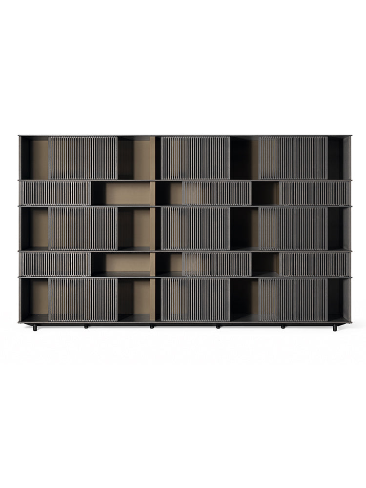 description | With the Lloyd storage units and bookcases Jean-Marie Massaud designs a system of variable geometries. Thin vertical wooden rods create light grilles that run from top to bottom on invisible horizontal rails. Each grille can be moved as desired to create sequences that are different each time. A fluctuating score of solids and voids, of light and shade. A sensual game that offers a glimpse of the contents, books and objects without fully revealing them. The most advanced technology is combined with traditional materials, wood and saddle leather, to form a solid and minimalist structure. |