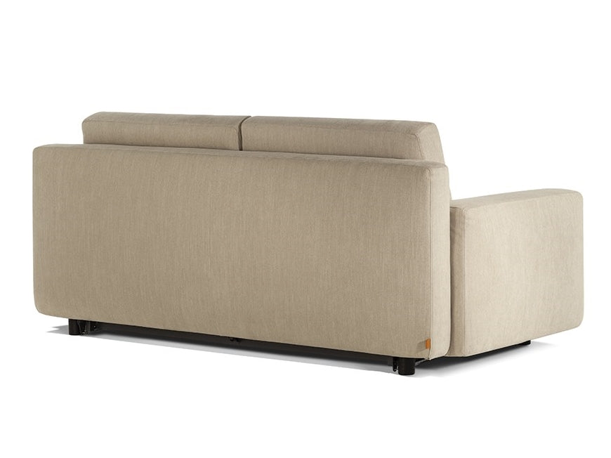 description | The convertible sofa, as well as the elements in single seats, can function independently or be easily combined. It is available with medium or low armrests, and the chair and backrest cushions are integrated into the structure so that they remain attached when the bed is unfolded. The integrated tilting mechanism allows you to transform the sofa swiftly and easily into a bed, facilitated by a saddle-leather handle. The mattress rests on a 182-stave mesh base and is offered in a single pocket spring version measuring 140x200x14 cm. The cylindrical feet in black lacquered aluminium complete the structure. It is upholstered in Pelle Frau® leather or in a completely removable fabric cover that combines practicality with high quality materials and manufacturing. |
