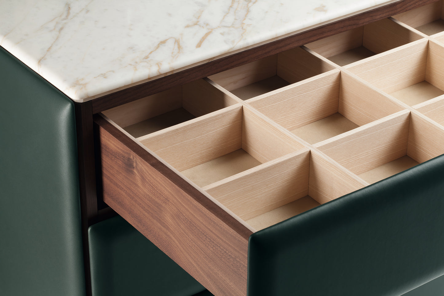 description | Moondance dresser, tall boy and bedside table. A collection of accessories that transforms the bedroom into a luxurious intimate and welcoming personal oasis. Roberto Lazzeroni designs familiar and reassuring forms that transmit new tactile and visual emotions through the elegant use of materials, creating a cosy and relaxing atmosphere. The volumes lighten and open thanks to delicate converging lines. |