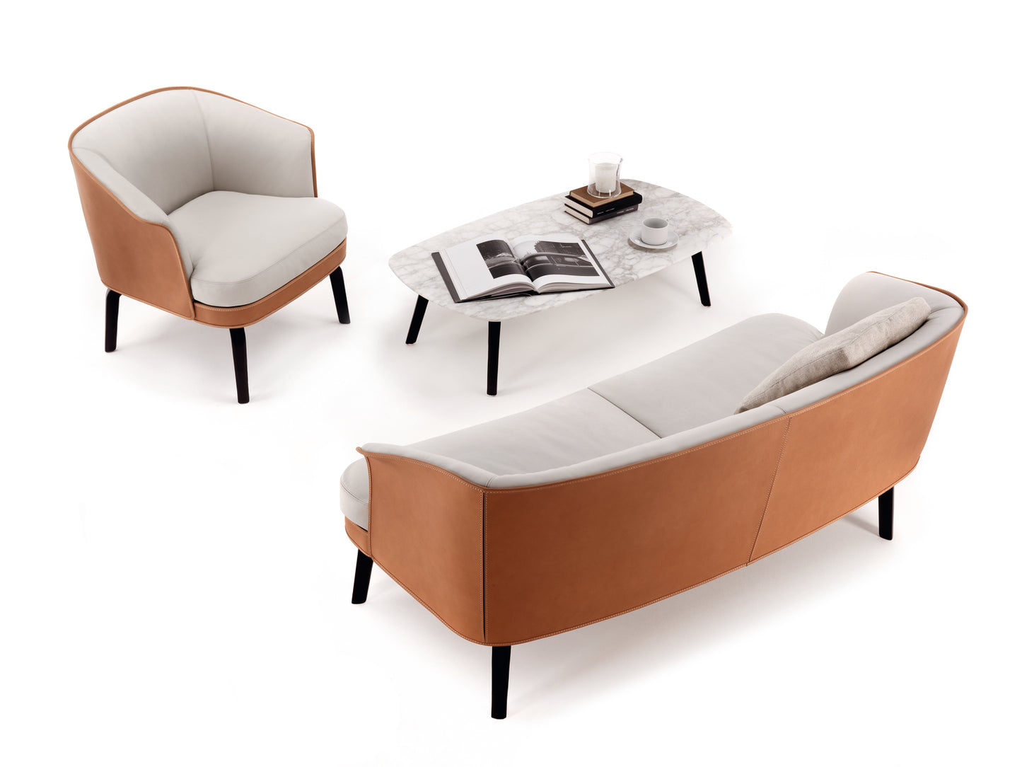 description | Light, feminine, highly alluring: Roberto Lazzeroni’s Nivola armrest and sofa stand out for their clean, streamlined designs. Simple and precise lines for a compact and rounded seat, enhanced by warm and natural materials expertly processed by Poltrona Frau. |