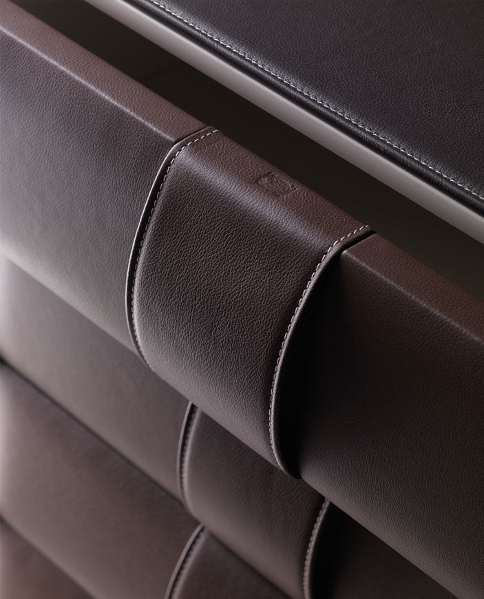 description | A complete, versatile storage system that is perfect for creating harmonious ambiances in the bedroom. Two different bedside cabinets, a spacious drawer unit and a chest of drawers. Each item is a precious object. The drawer fronts and handles are fully upholstered in Pelle Frau® leather in matching or different colours, with ton-sur-ton or contrast stitching, making for a refined, decorative effect. Obi is available lacquered with scratch-resistant coating in a milk or wood colour and with a Brown Walnut rotary-cut veneer. The top of each Obi storage unit can be completed, to order, with an elegant Pelle Frau® leather mat. |
