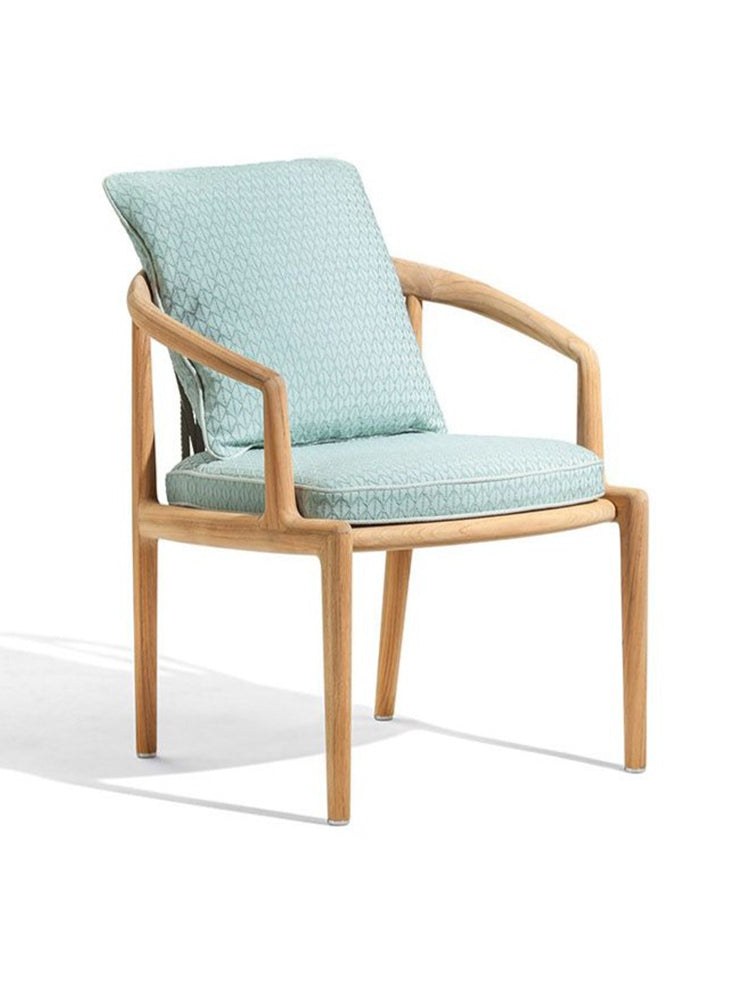 The comfortable outdoor chair in solid teak wood is designed to complement the outdoor dining table from The Secret Garden collection, design by Roberto Lazzeroni. Generously proportioned and ergonomically designed, featuring armrests and a wrap-around backrest made from a special weave of two-tone cotton webbing in ecru and taupe, which supports the optional outdoor backrest cushion for added support, Ideal for the lunch area of verandas, terraces, patios and open-air spaces, it adds a touch of elegance and personality to the setting. |