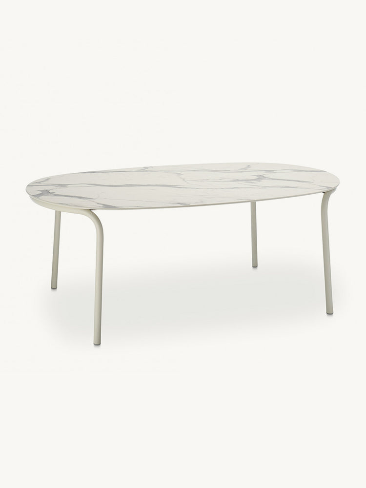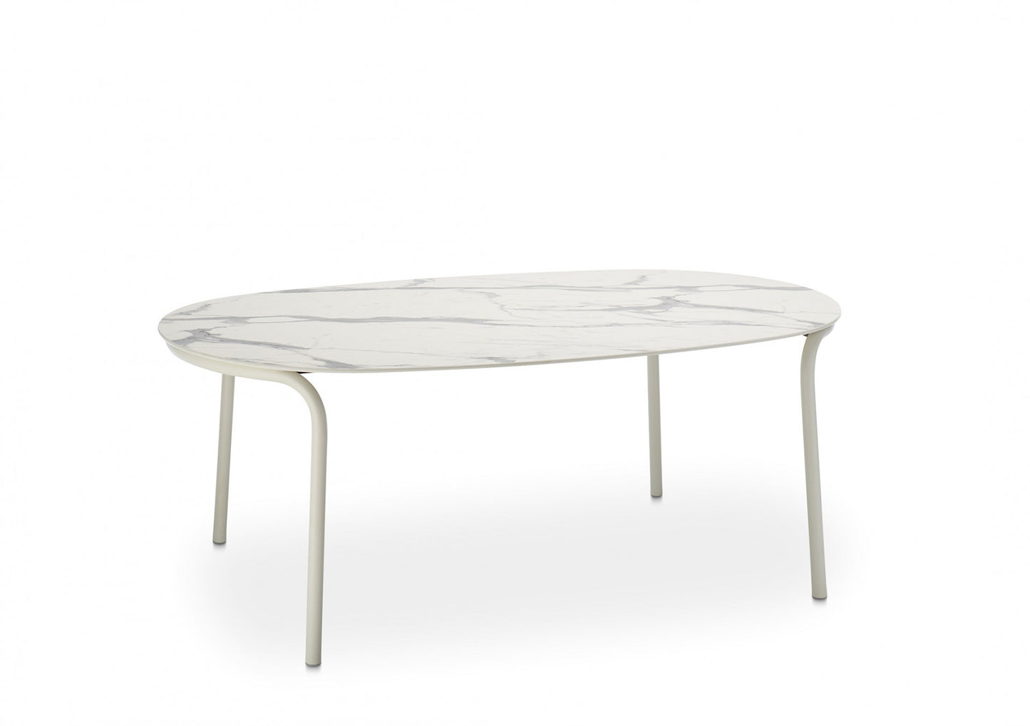 description | Oval table, base in powder coated 304 steel. HPL top. A dynamic design, where the sinuous tube of the frame is the protagonist. The profile has generous dimensions and a simple but functional development. The quality of the materials makes it ideal for both indoor and outdoor use, suitable for residential and contract furnishing. |