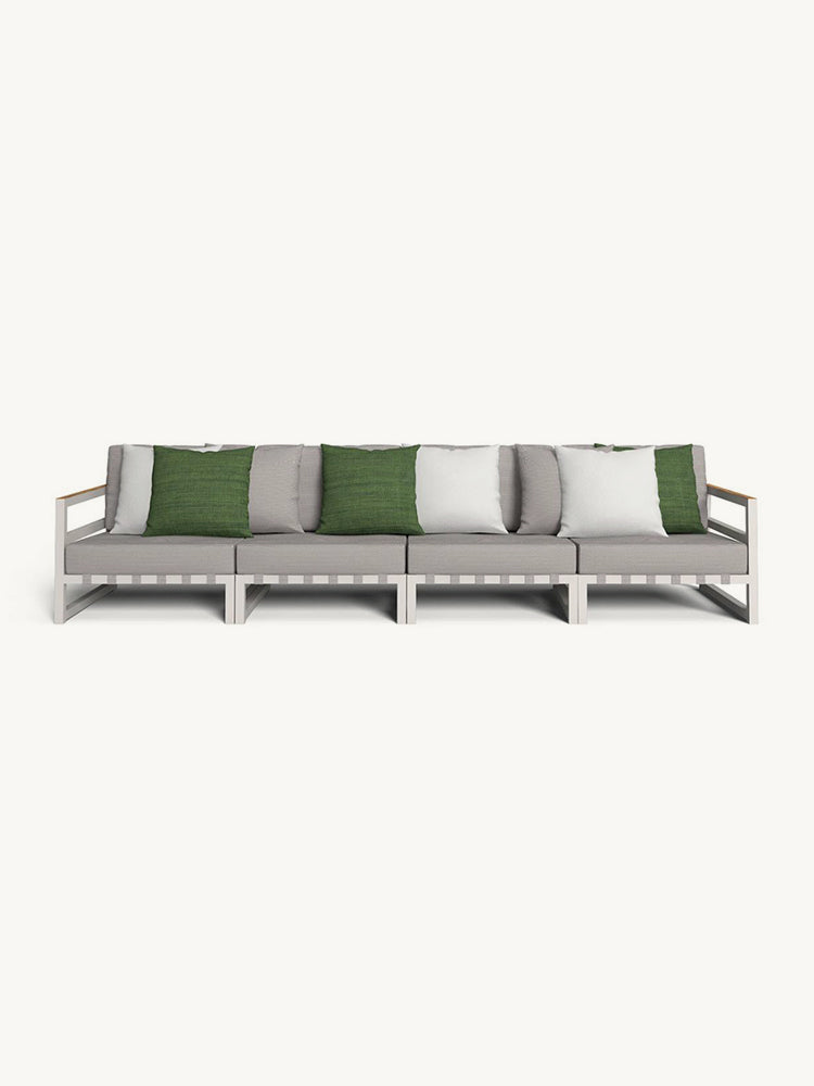 description | The linear design and the artisan tradition flow together in the Alabama collection, perfectly synthesized by the sophisticated modular sofa. The seat, comfortable but not wide, has a geometric style, opposing to the soft and large backrest cushions. The sofa is the focal point to any elegant and timeless outdoor space. With a a powder-coated aluminium frame, it is enriched by teak slats along the upper part of the frame (back and arms). The polyester belts, perfectly coordinated to the cushions fabric, support the seats and the backs. The padding is in quick dry foam and the cushions have removable covers, easy to wash and weather resistant, meeting the functionality and comfort requirements of outdoor furniture. |