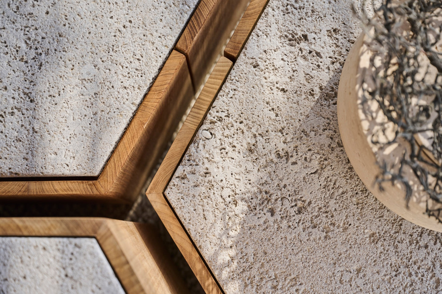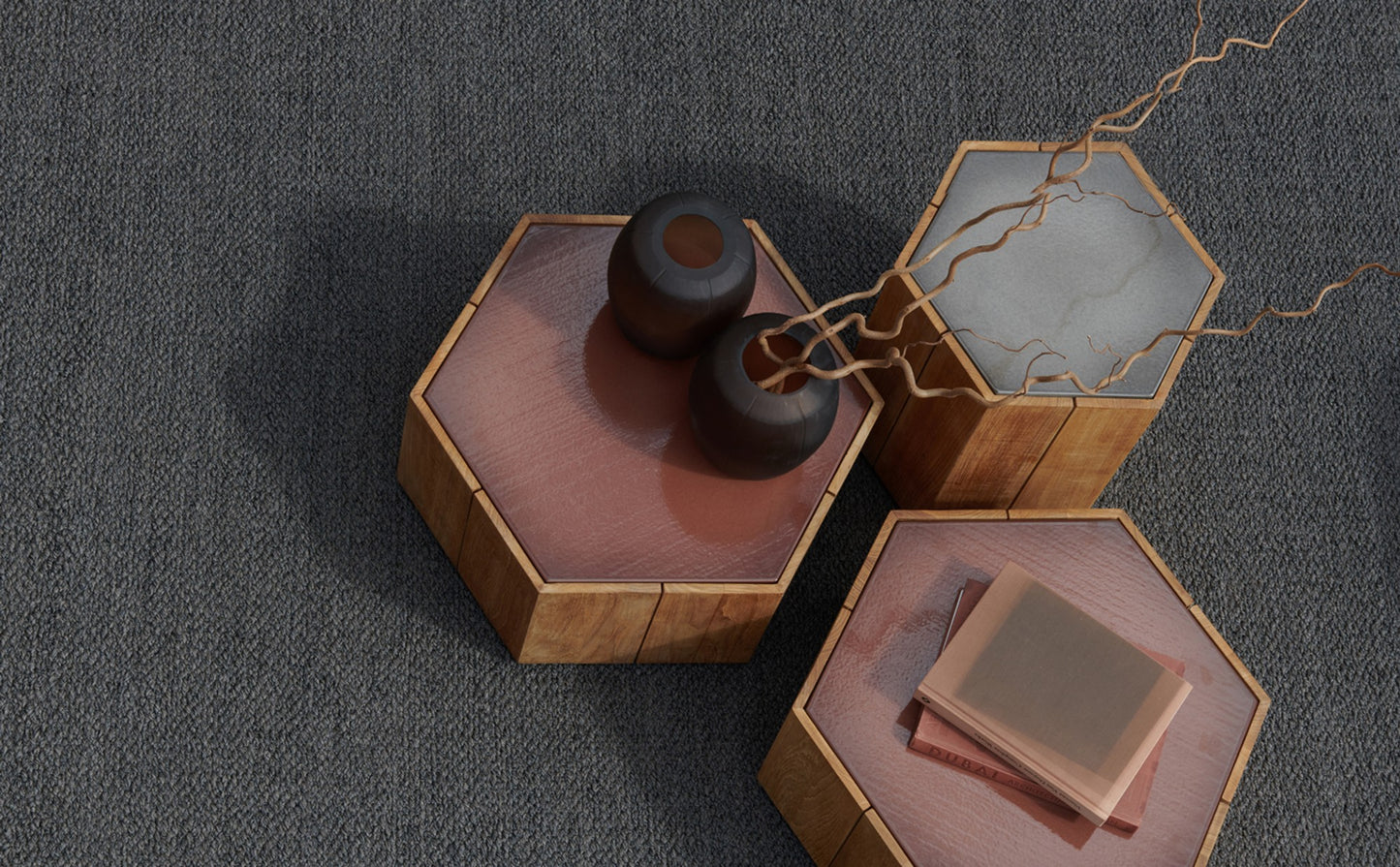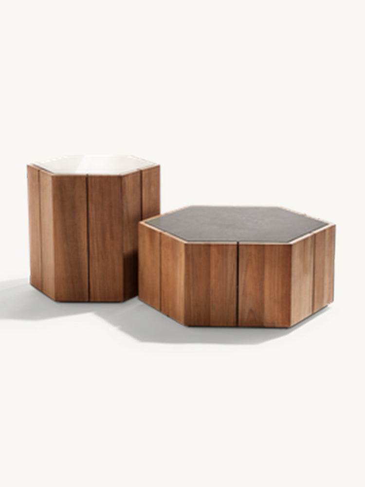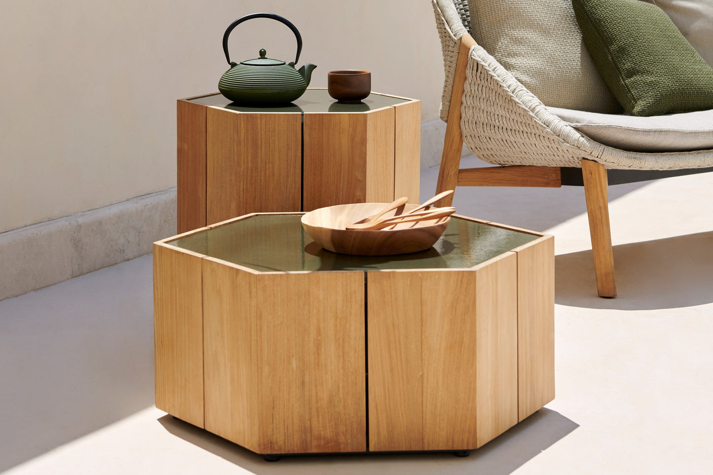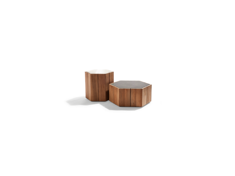 description | Marc Merckx's Hexagon tables prove that nature is an inexhaustible source of inspiration for new designs. The side tables' teak support refers to the hexagonal basalt pillars of the Giant's Causeway, a rock formation in Northern Ireland that has been declared a UNESCO World Heritage Site. Moreover, Merckx swears by sophisticated proportions, which is why the perfect symmetry of the honeycomb was his second source of inspiration. The Hexagon table top is made of handcrafted glazed lava stone with a subtle craquelure effect that highlights the natural imperfections in the stone. The coloured glaze, applied by hand, ensures that the top is water, heat, frost, UV, and stain-resistant. Hexagon is equally beautiful on its own as in a multiunit layout. |