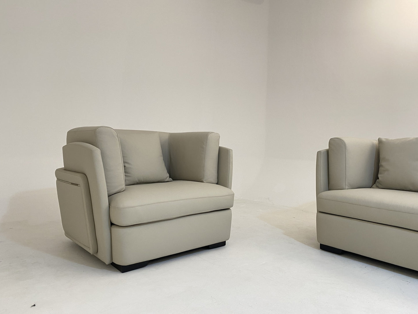 description | The armchair of Blanche collection is glamorous and refined, with an almost suspended light design with soft lines. The metal feet lift the soft structure covered in leather or fabric, the back has a 3D effect thanks to panels of different sizes positioned on different levels. |