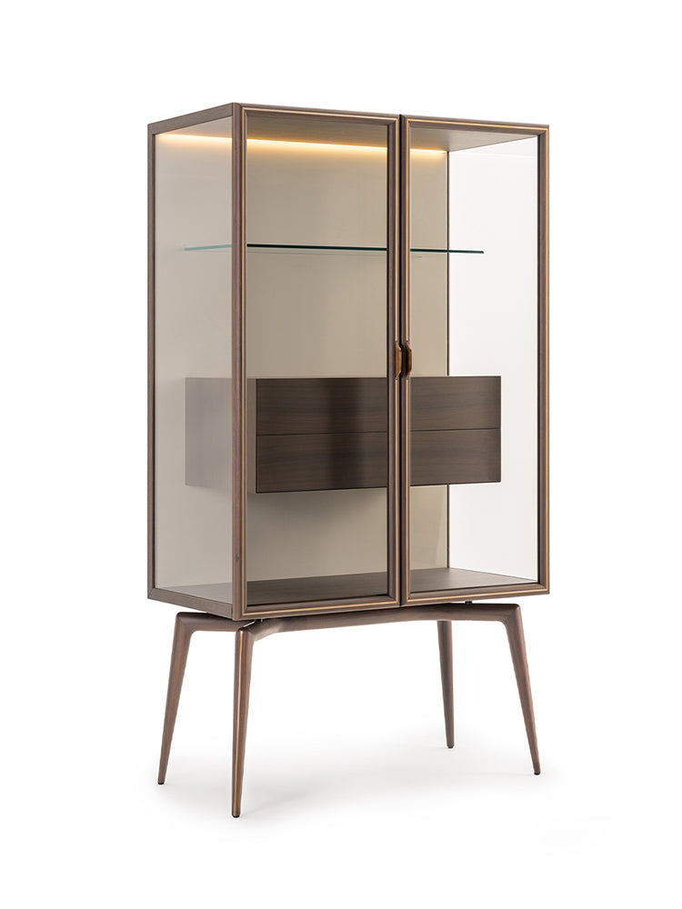 description | The vitrine of the Blues collection enhances lightness. The glass sides meet the solidity of the drawers with metal edges which, fixed to the bottom, seem almost suspended. The whole is supported by slender and slender legs, typical of the collection, transforming it into a real jewel. Its linear appearance, easily adaptable to any type of space and furniture, makes the vitrine perfect for any living area. |