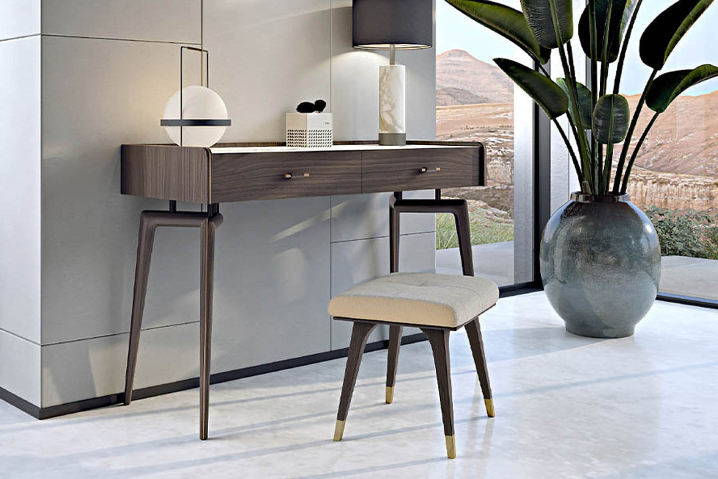 description | The Blues dressing table has a walnut wood structure whose design, with tapered legs, has a touch of vintage. The two drawers can be made with leather or wood fronts. The top can be customized in marble, wood or leather. |