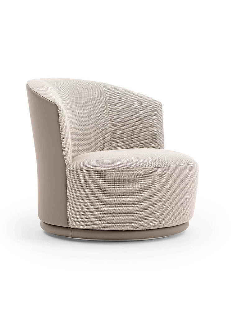 description | The small armchair of the collection Blues is a versatile element, perfect for any type of environment. The swivel base allows you to experience this comfortable seat on every side, from the backrest covered in leather, to the soft interior covered in fabric. |