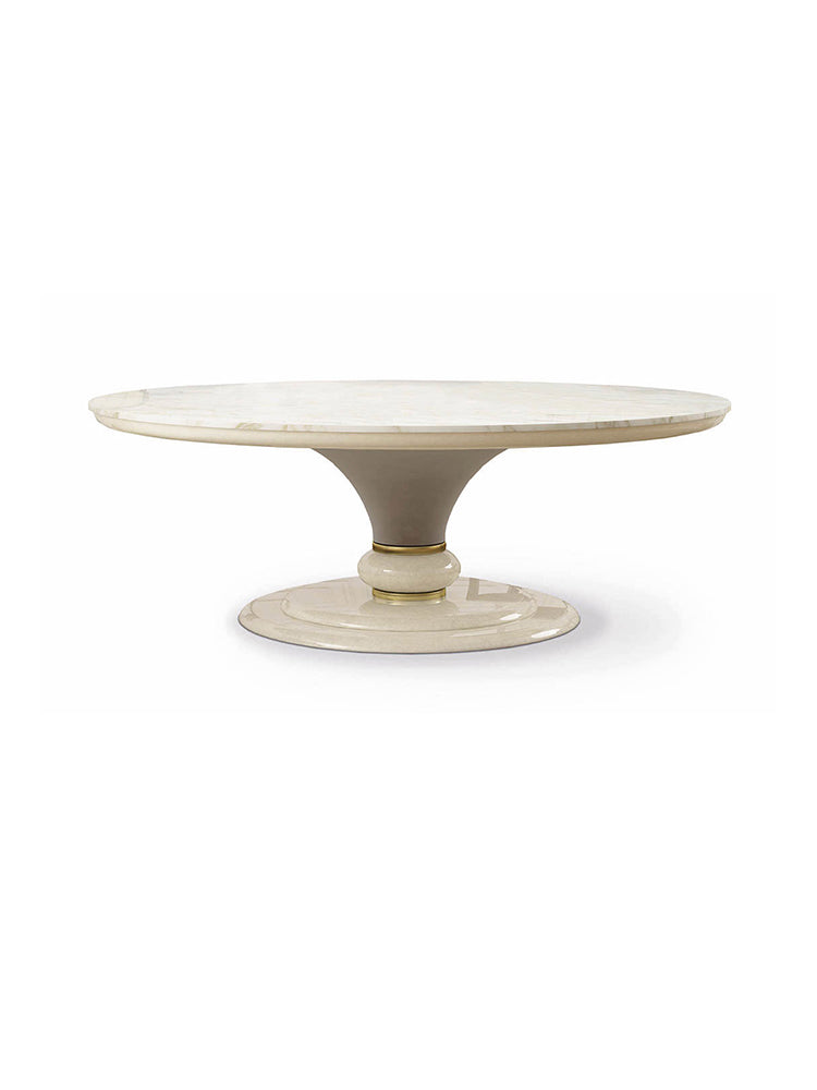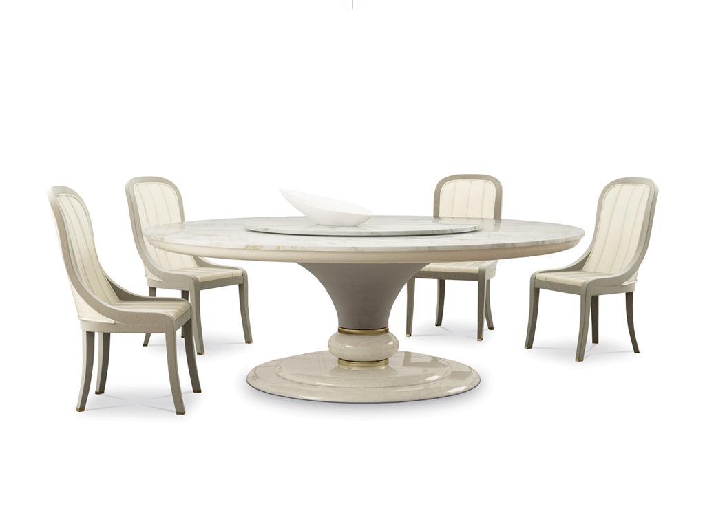 description | The round table from Caractere collection has a wooden structure with a central leg covered in fabric. The base is one of a kind, thanks to the game of rings and spheres, that creates an elegant and refined structure, also enriched by the wooden or marble top. It is possible to add a lazy susan. |