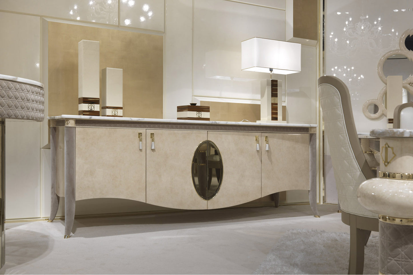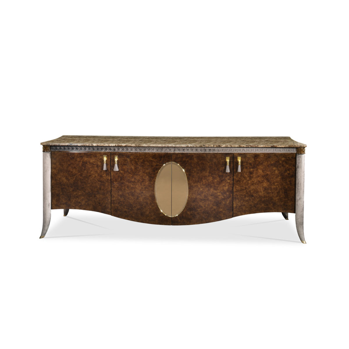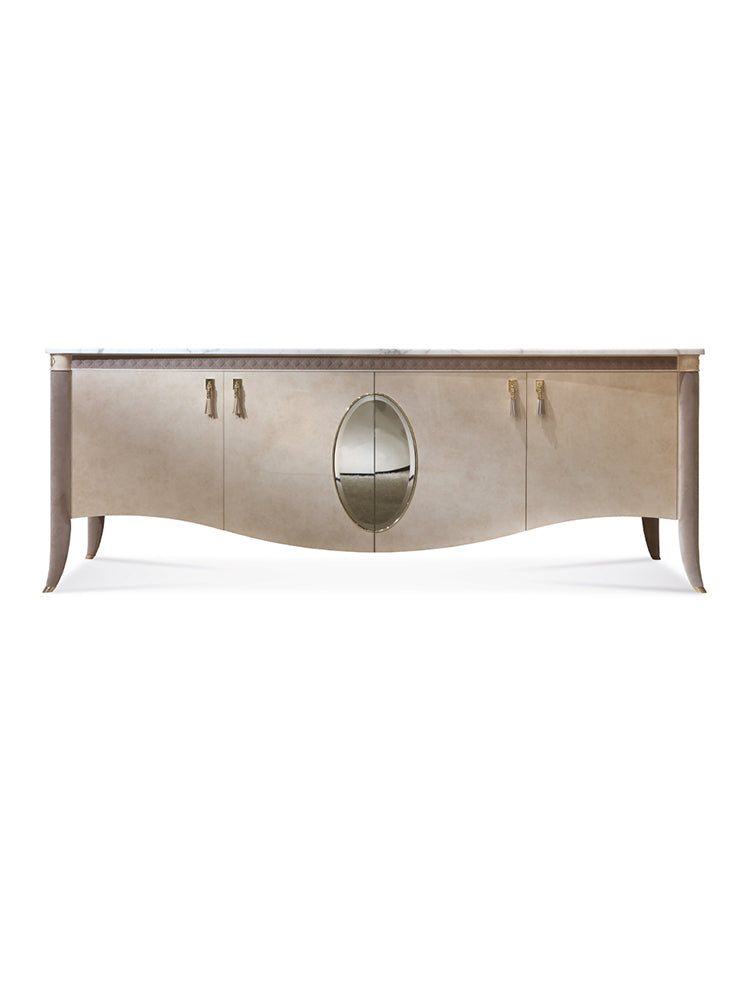 description | The sideboard of the Caractere collection is characterized by sinuous shapes that balance its design. The wooden structure contrasts with fabric applications on the legs and an embroidered section just below the marble or wooden top. The storage unit has four doors, the two central ones are embellished with an oval insert in mirrored gold. |