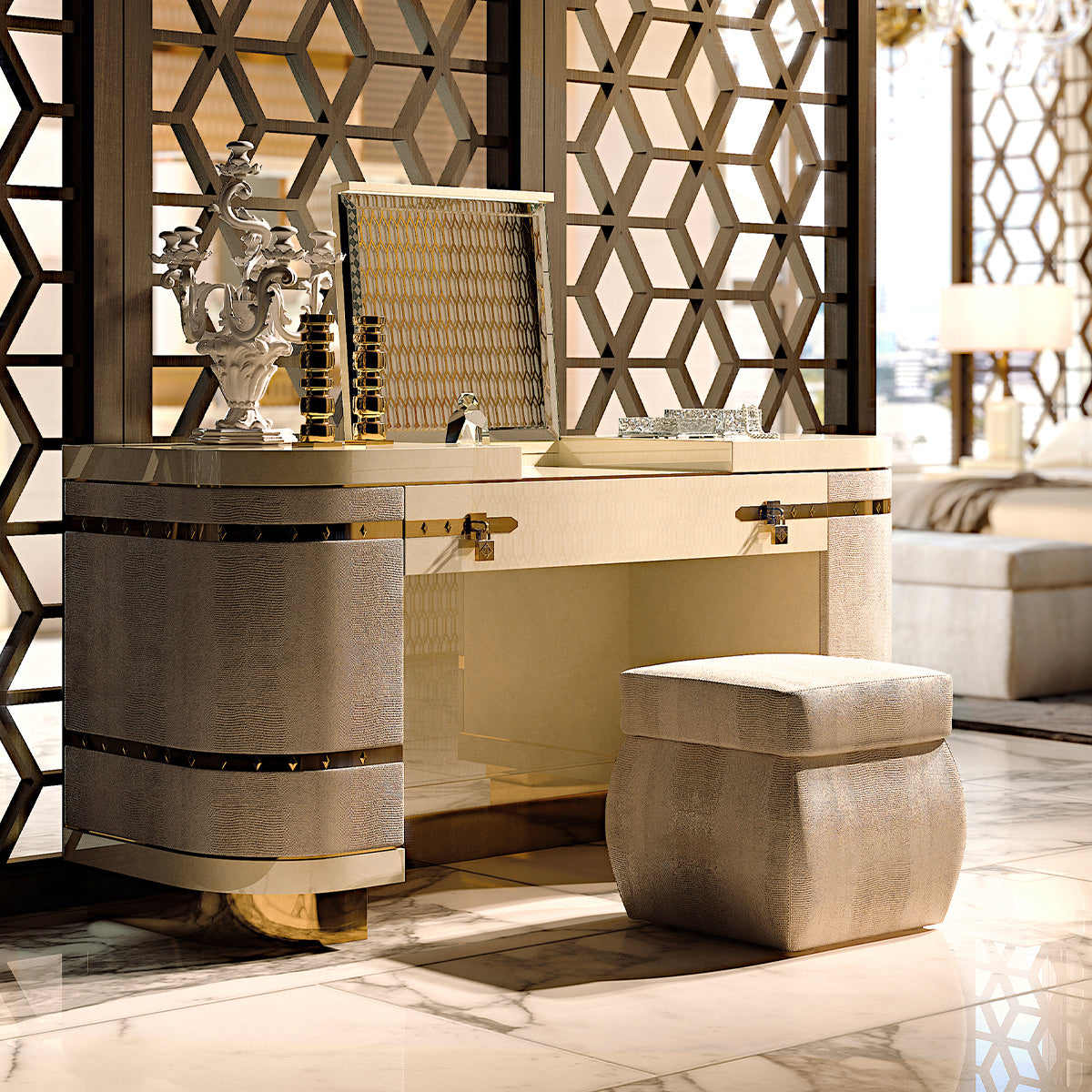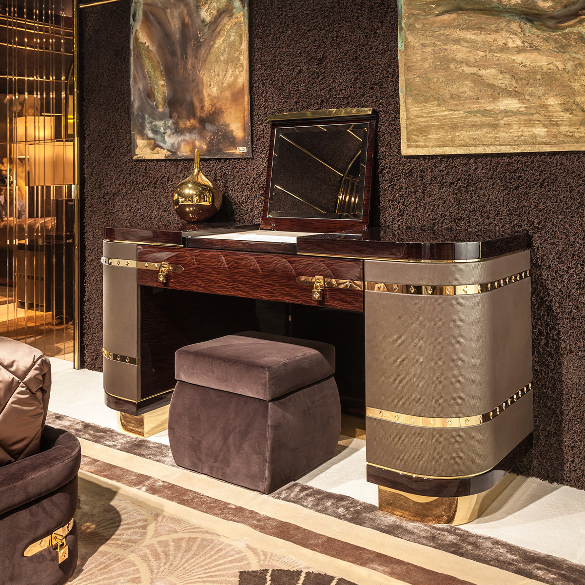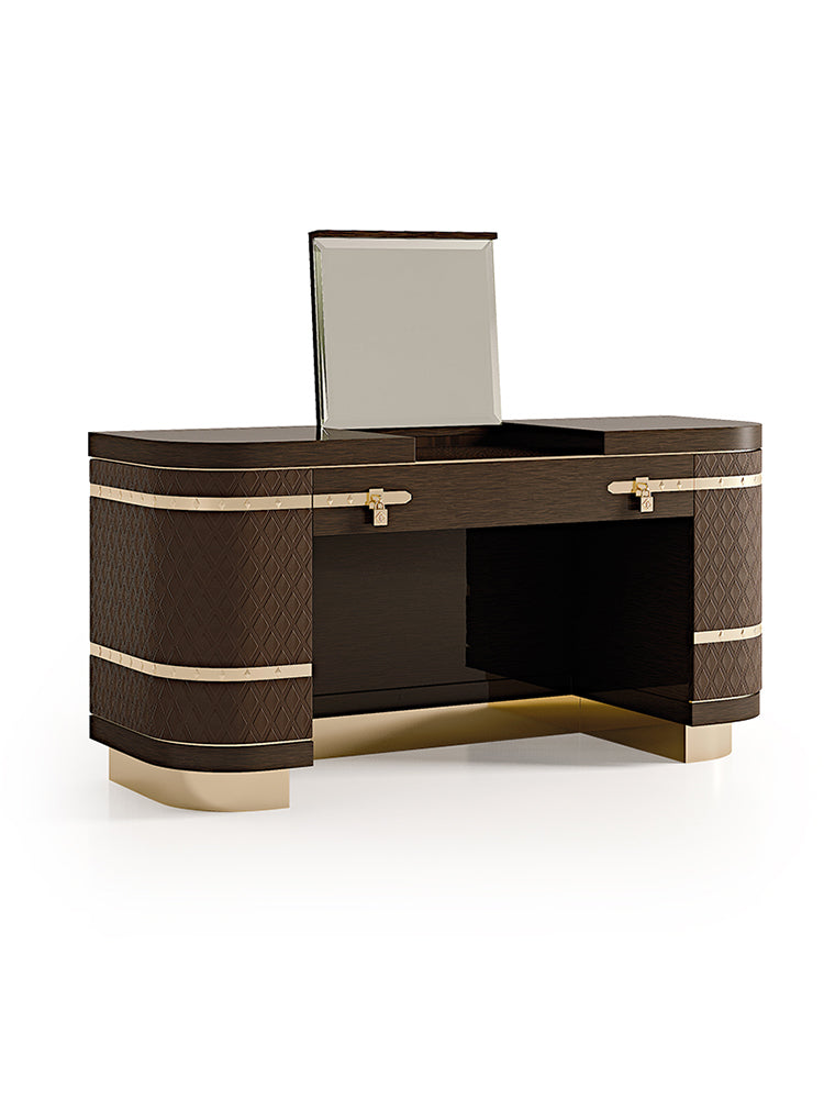 description | The dressing table of the Diamond collection is elegant and functional, it consists of a wooden structure in glossy lacquered finish with curved side sections covered in leather. The wooden central drawer is in glossy lacquered finish, as well as the top that hides a tilting mirror. The padlocks, the base and details in gold metal enhance the luxury of this complement. |