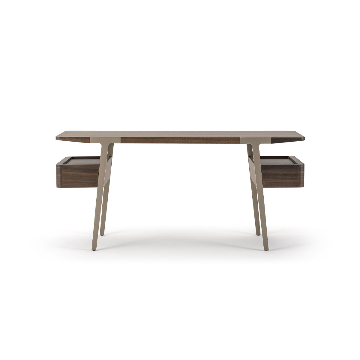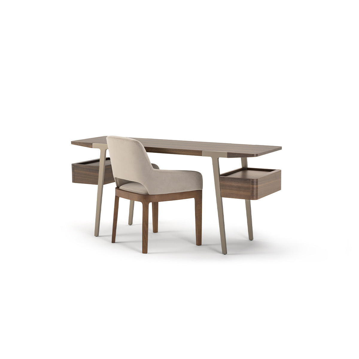 description | The bedroom area is completed by the Domus dressing table, a versatile and functional piece of furniture thanks to the top and two side drawers in Eucalyptus. The legs are made of Matt Light Platinum metal. |