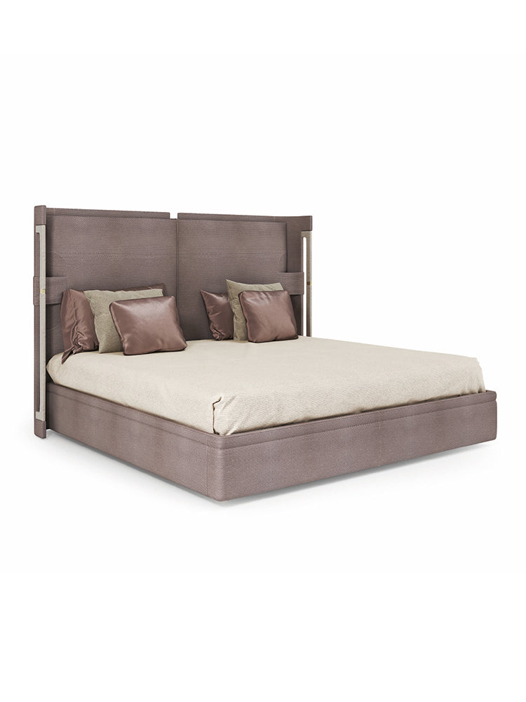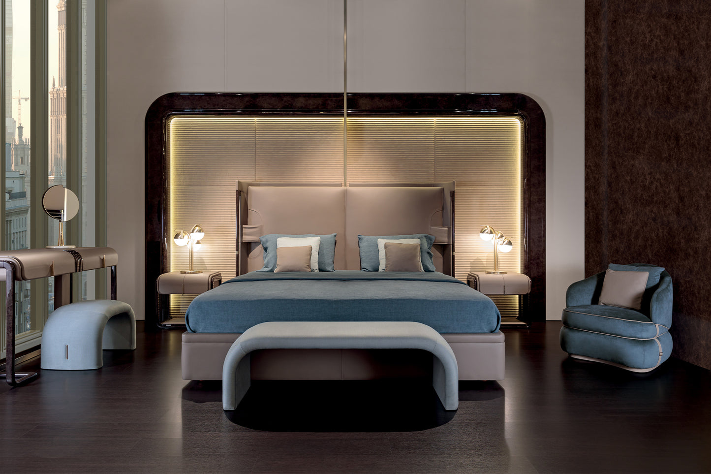 description | Eclipse bed is characterized by a design with modern and clean lines, almost entirely covered in leather or fabric. The headboard plays with wrapping bands on glossy lacquered wooden elements. It is ideally divided in two sections by the soft and tempting upholstery. The bed is available in standard size or king size. The light gold details enhance the shapes. |