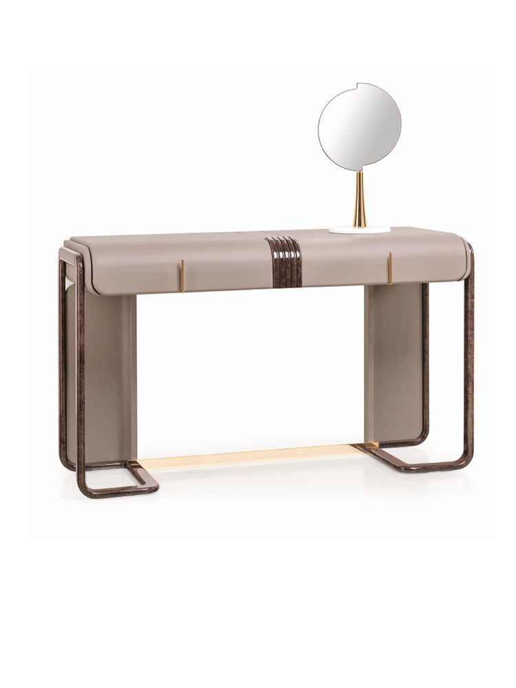 description | The dressing table of the Eclipse collection has rounded volumes with modern lines, covered in leather with wooden structural elements in glossy lacquered finish. The dressing table is equipped with an optional mirror with a marble base. |