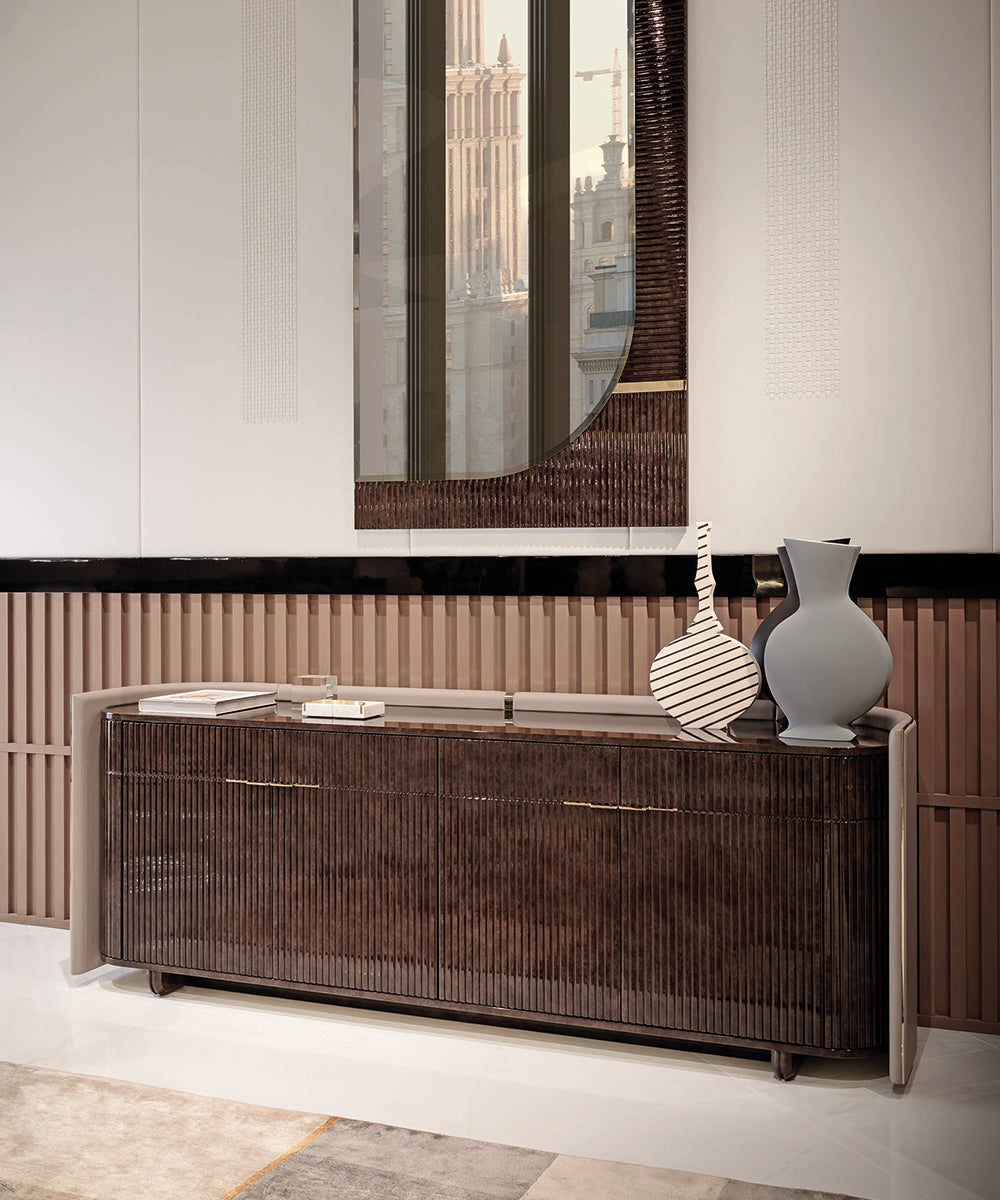 description | The sideboard of the Eclipse collection is characterized by a wooden structure, wrapped in a shell covered in leather. The four hinged doors are worked with grooves to create a striking three-dimensional effect. |