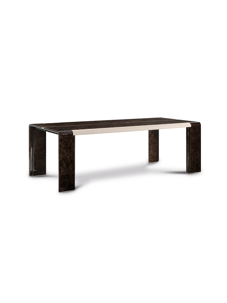 description | The rectangular table from Madison collection is designed to give space to conviviality. The structure made of a single piece where the legs become curved wing downwards, is made in glossy lacquered wood. The leather inserts on the sides and the light gold metal insert that runs through all the top transfer elegance to the model, suitable to furnish modern dining spaces. |