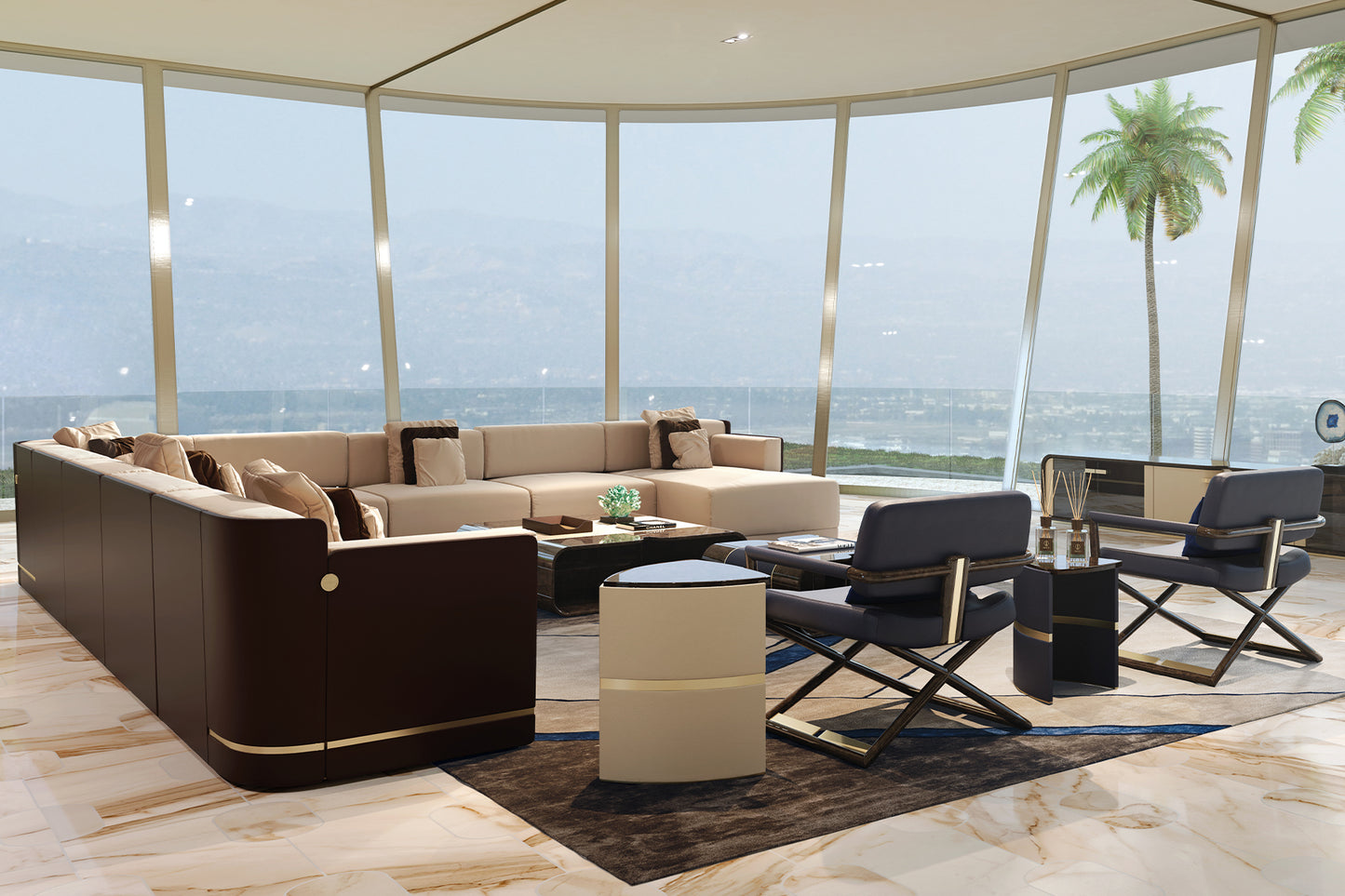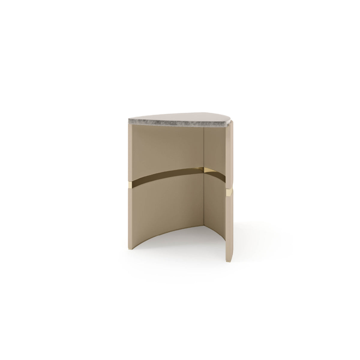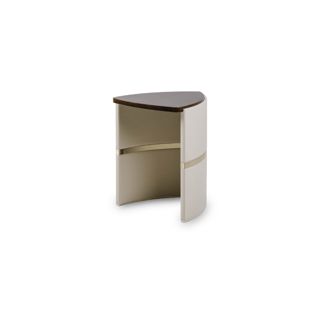 description | Side table from Madison collection is an object apparently simple but has a complex manufacturing, it has a structure covered in leather with top in glossy lacquered wood, it has a particular triangular shape opened on one side. Different heights give the possibility to compose and match the coffee tables, details in light gold metals highlight the shape. |