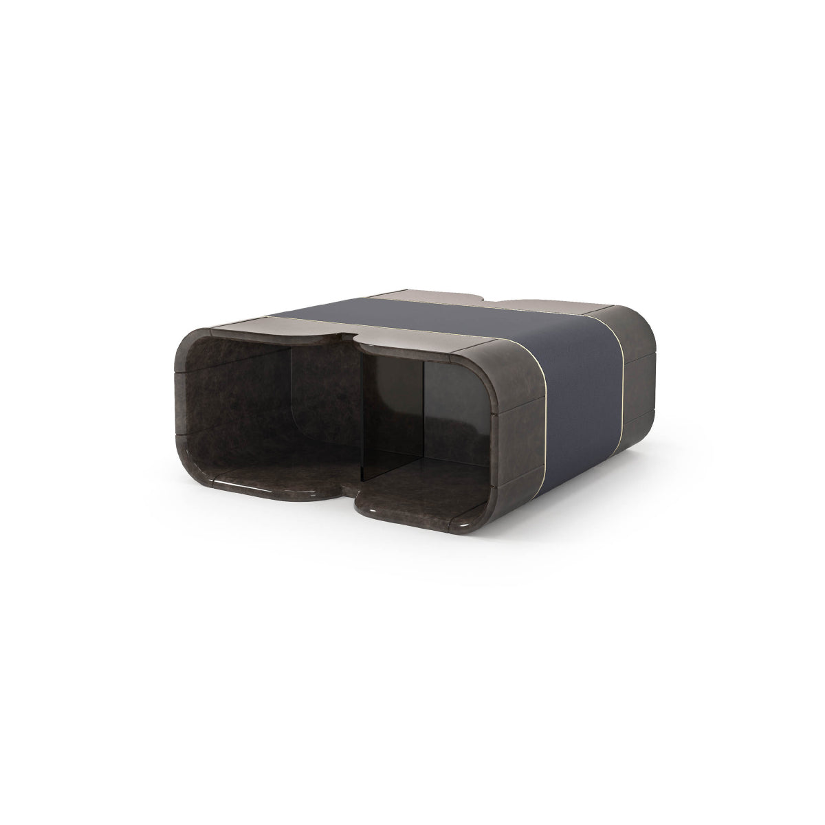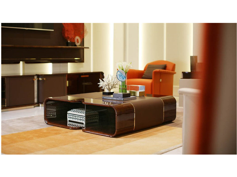 description | Squared coffee table from Madison collection is a compact complement with curved design, the structure is in wood with application of a leather band that crosses the top to the sides. Available in two sizes, inside has a open space divided in two parts by a glass partition, in order to divide the space. Light gold metal details highlight the shape. |