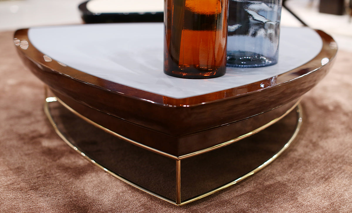 description | Triangular coffee table from Madison collection has a contemporary style highlighted by metal structure that supports a glossy lacquered top with leather application in the center. The coffee table is available in three different sizes, in order to give space to competitive imaginative games. |