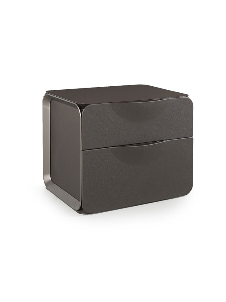 description | The bedside table of the Milano collection has a compact and solid structure entirely covered in leather, the shapes of the structure are highlighted by side elements in satin nickel metal. It is equipped with two drawers entirely covered in leather, it has a wooden top in glossy lacquered finish. The bedside table is also available in the version with one drawer. |