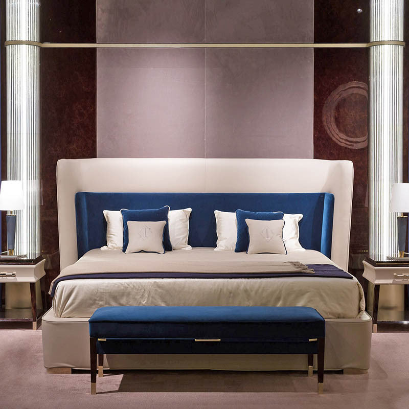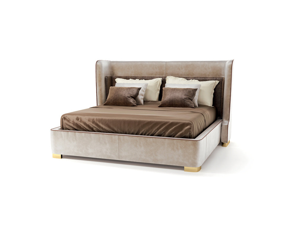 description | Noir bed has a wrapping structure, completely upholstered and covered in leather or fabric. The headboard is designed with two bands, with which is possible to play in contrast using different materials and colours. The gold metal feet give a touch of light to the important frame. |