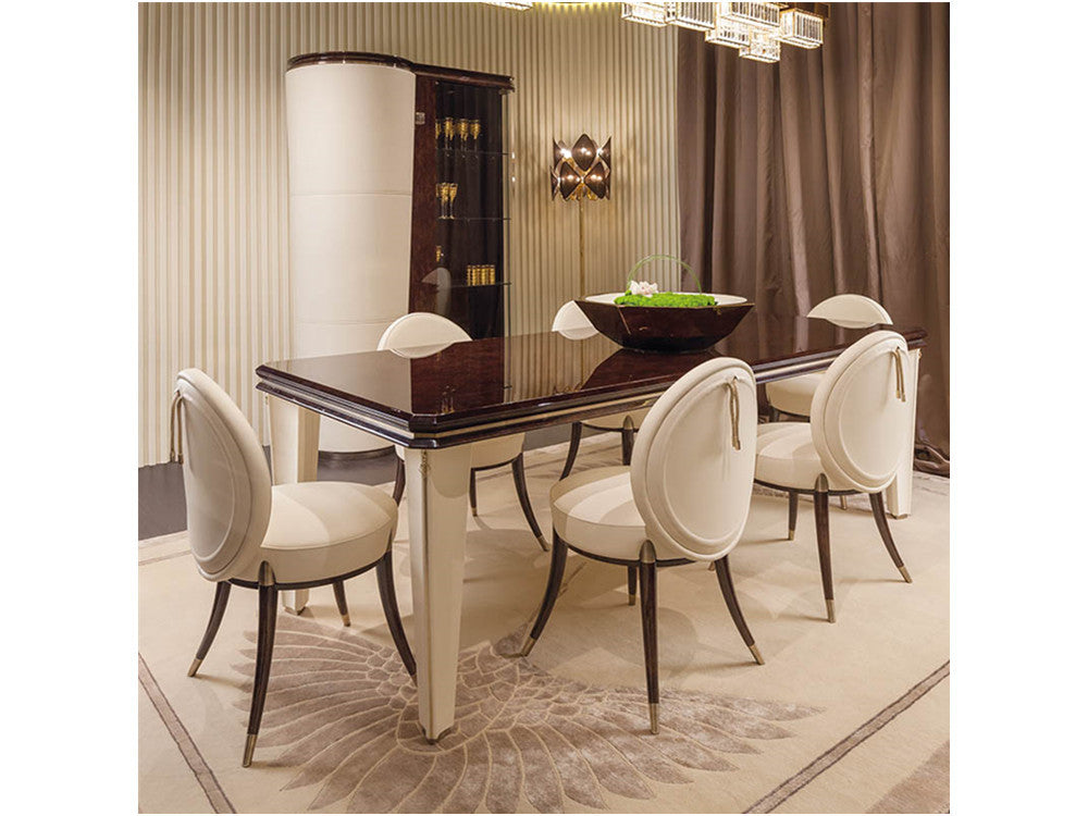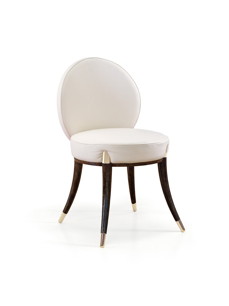 description | The chair from Noir collection has a wooden structure covered in leather with jewel details that frame the backrest. With a simple but winding shape, they enhance the dining room thanks to the light gold metal details. |