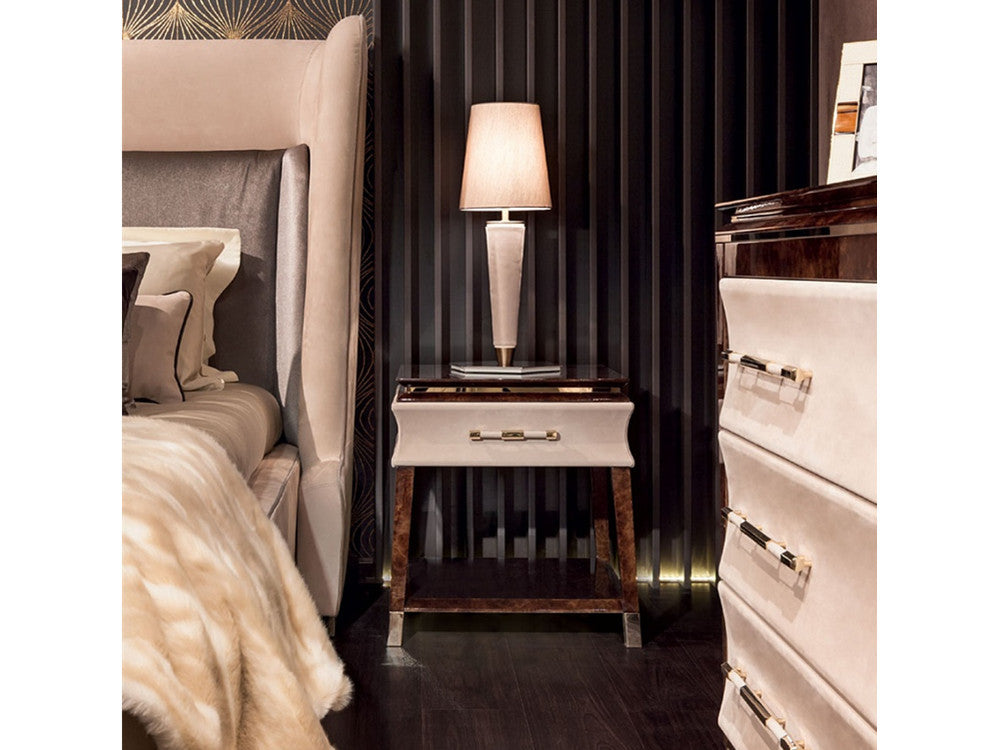 description | The bedside table of the Noir collection is equipped with a drawer covered in leather with a rich handle in gold metal, the wooden structure and the top are in glossy lacquered finish, the top is also available in marble. |