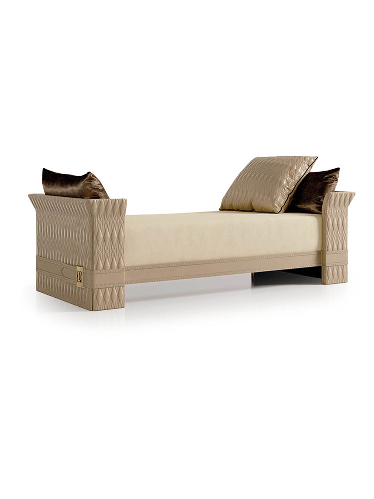 description | Bench from Numero Tre collection has an elegant design. External structure is covered in leather with rhombus embroidery, soft seat cushion is covered in leather or fabric, this item can be selected with contrasting coverings in order to make this accessory even more original. |