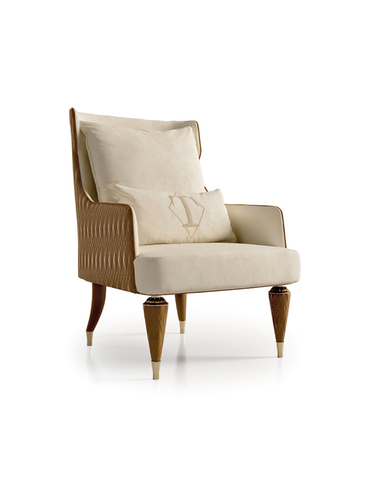 description | The bergere of Numero Tre collection is entirely covered in leather or fabric, the rhombus-quilted backrest together with the particular details in gold metal make this comfortable seat unique. The bergere can be customized by creating material contrasts between the external structure and the seat. |