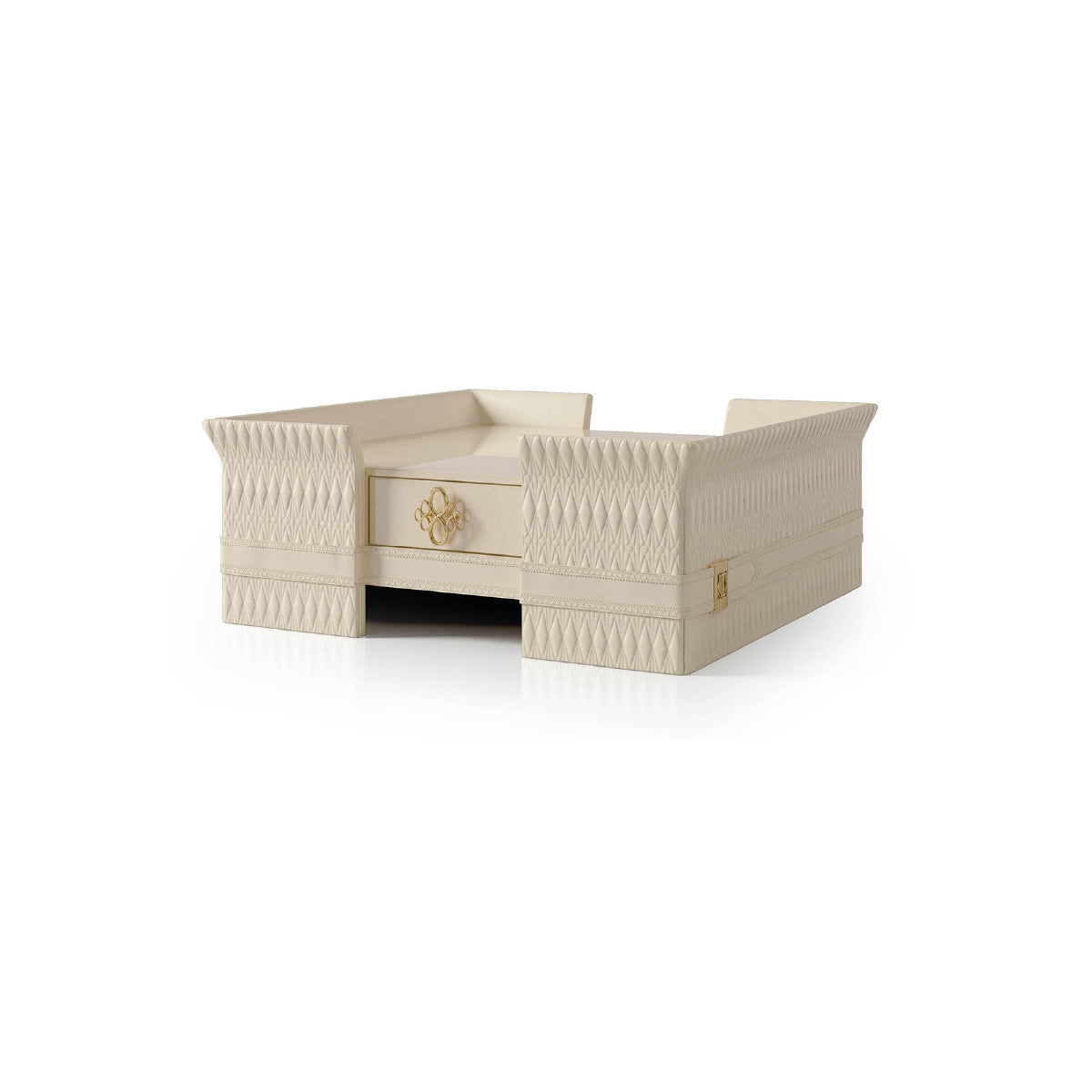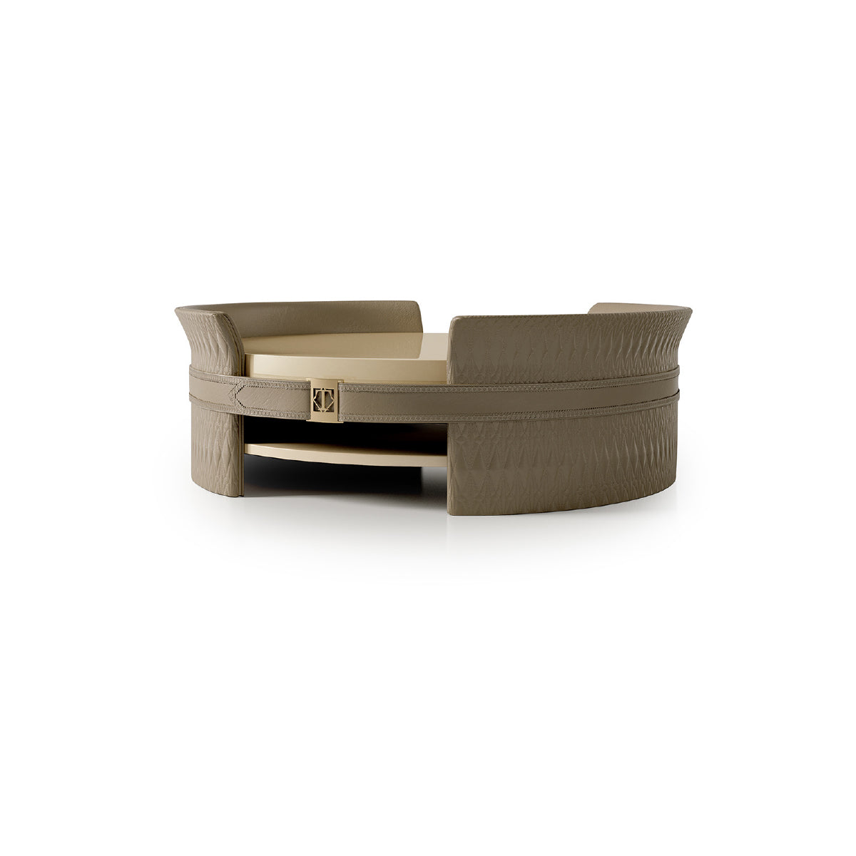 description | Round coffee tables from Numero tre collection are available in different sizes and heights, they are realized with wooden structure covered with embroidered leather and glossy lacquered wood elements. It is possible to customize the top with precious marbles. |