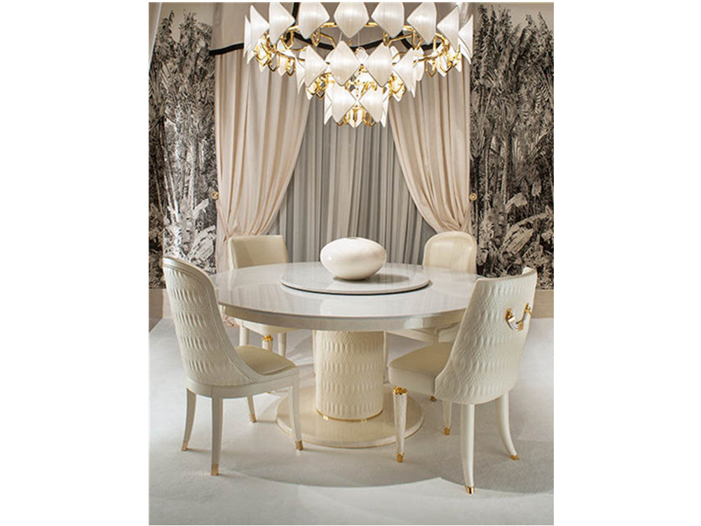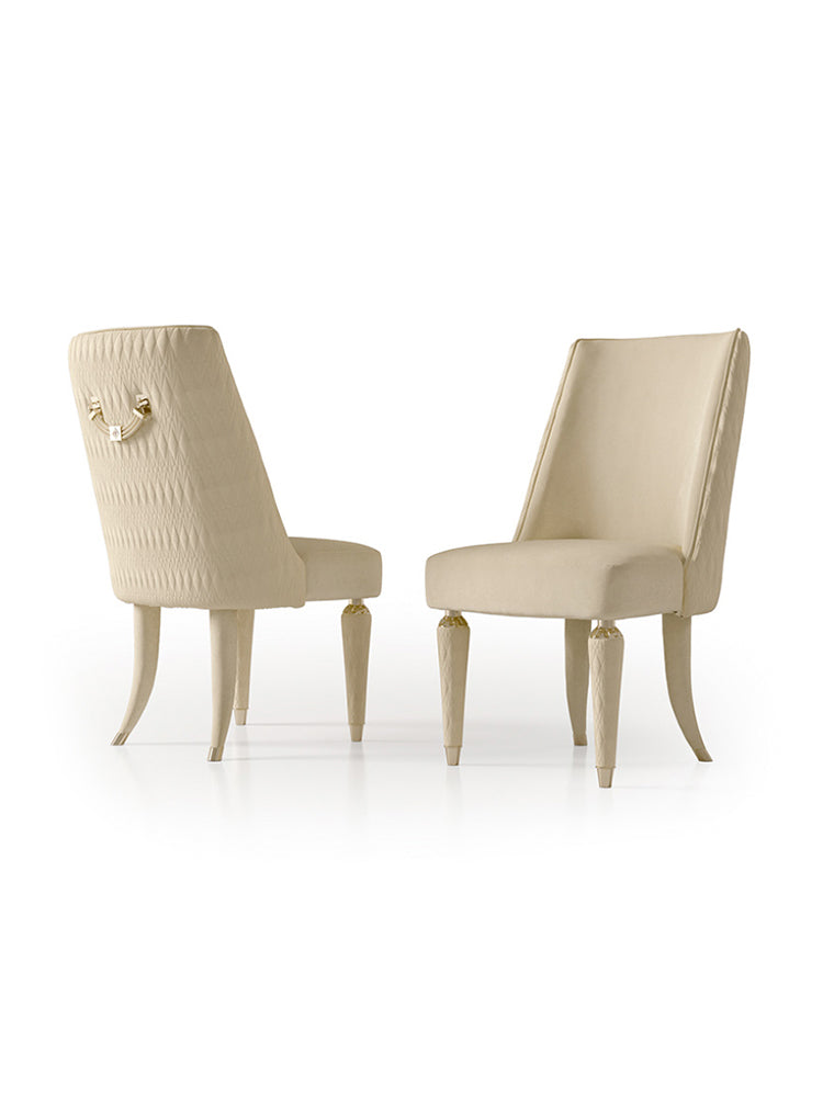 description | The chair from Numero Tre collection is a glamour and refined piece, covered in leather or fabric, recalls the decorative theme of the collection with quilting on legs and backrest. A woven leather handle with gold metals is applied on the back. |