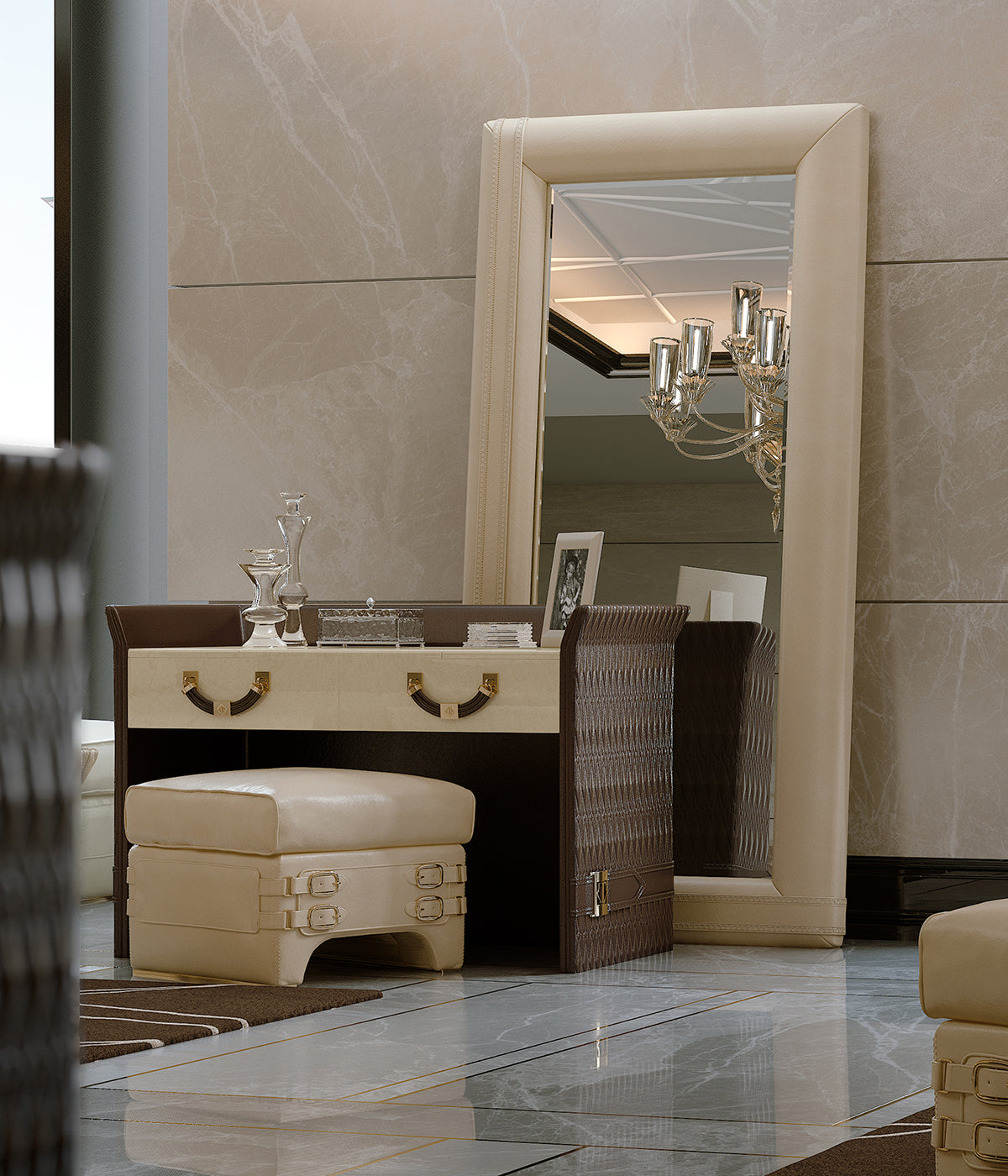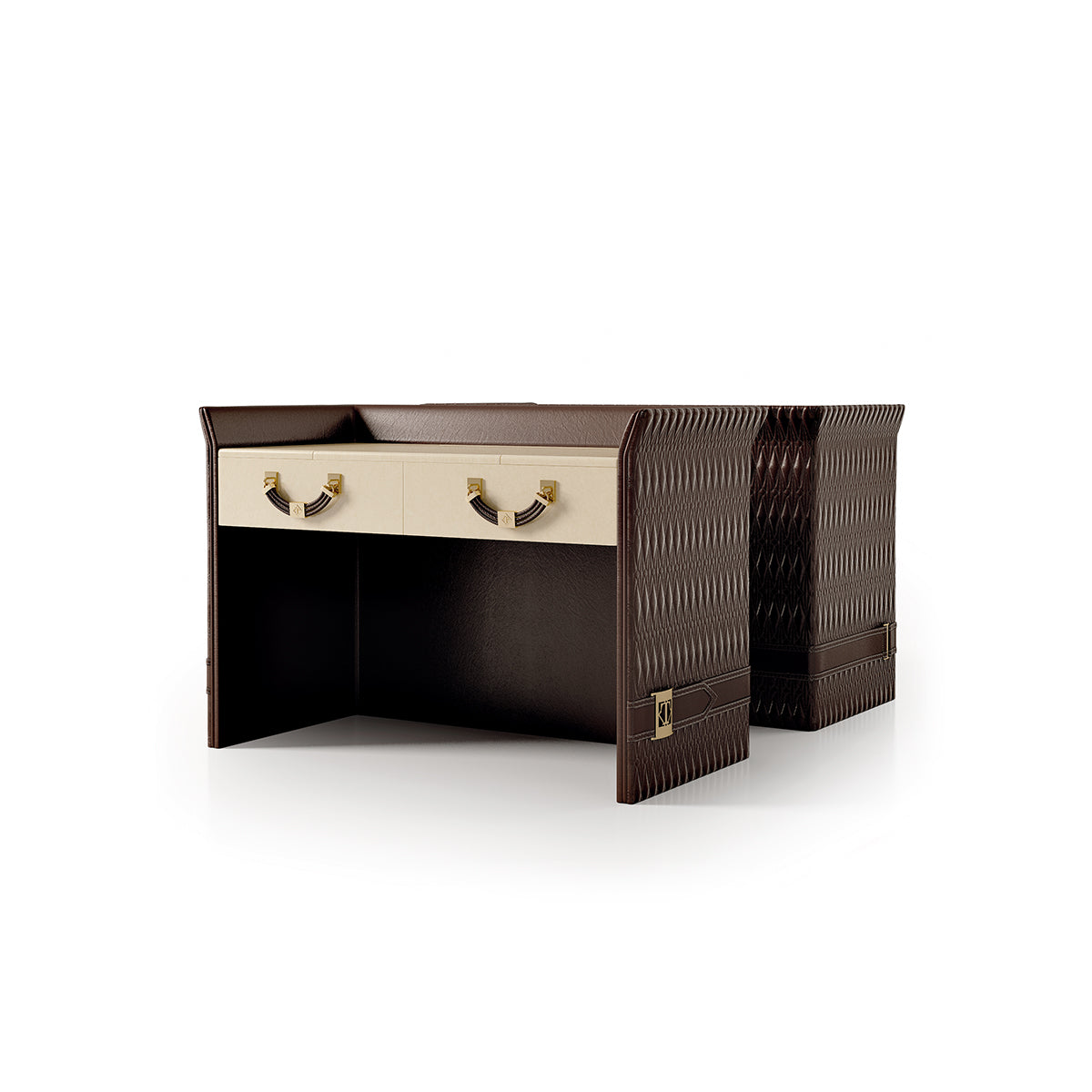 description | The dressing table of the Numero Tre collection is a complement designed to perfectly match with the other elements of the sleeping area, it has a structure covered in diamond-embroidered leather, except for the two drawers and the top which are in wood in glossy lacquered finish, the top it is equipped with an hidden tilting mirror. The handles are made of woven leather with gold metal details or entirely in metal. |