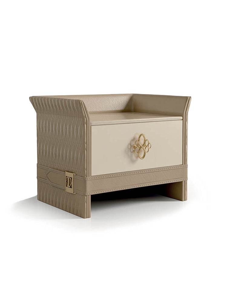 description | The bedside table of the Numero Tre collection is a luxurious and sophisticated complement, it has a structure covered in diamond-embroidered leather, except for the drawer and the top which are in wood in glossy lacquered finish, the top can also be in marble. The handle is made of woven leather with gold metal details or entirely in metal. |