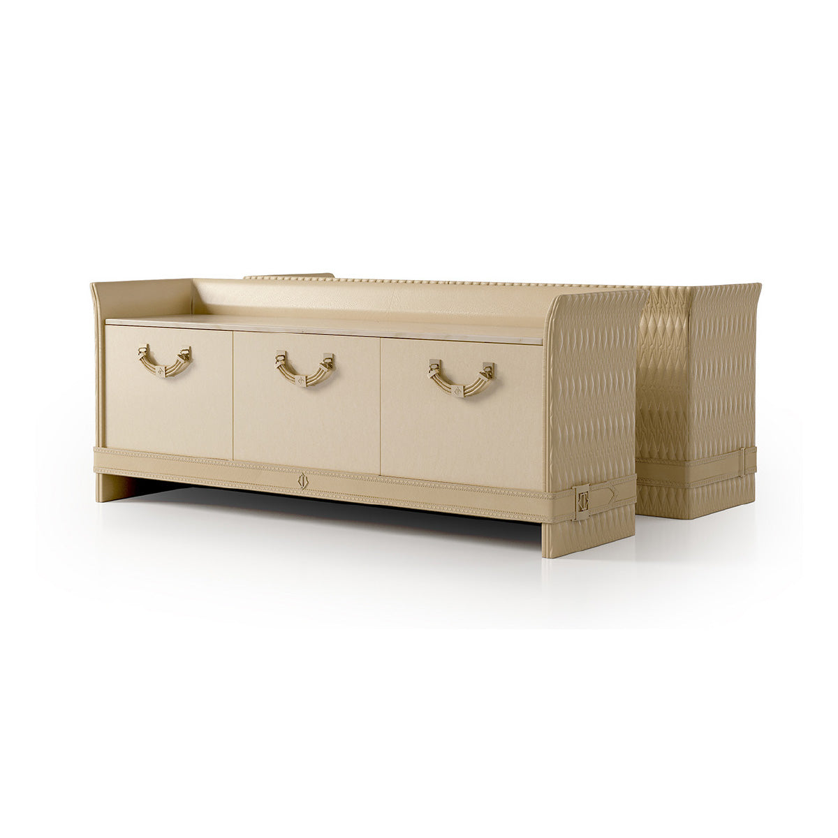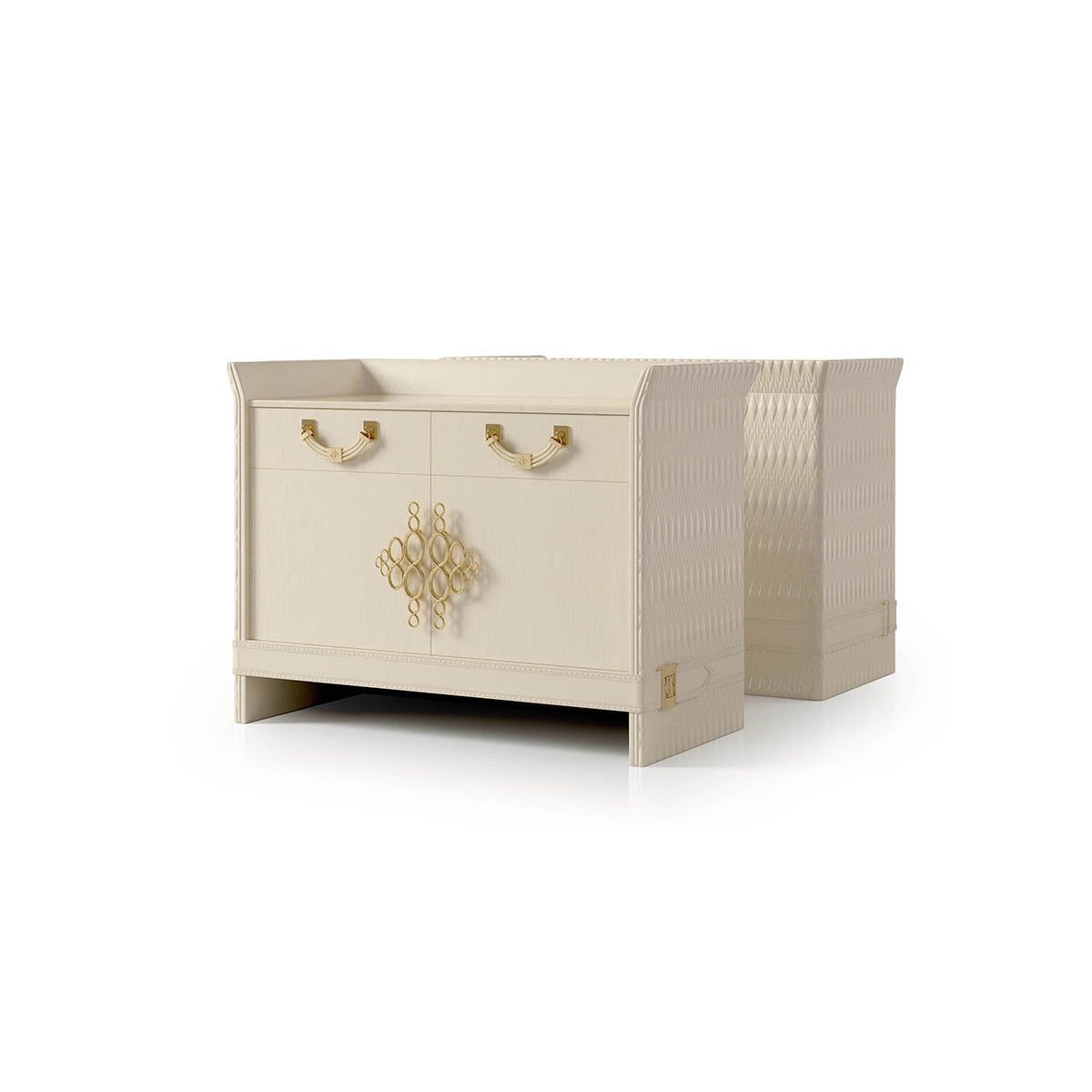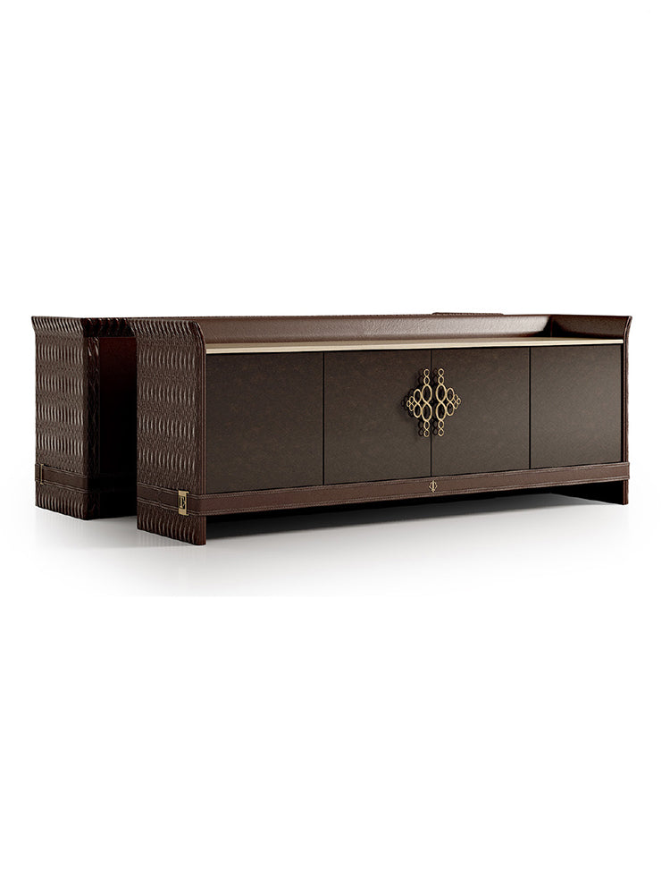 description | The sideboard of the Numero Tre collection designed to be functional and elegant at the same time, has a wooden structure with a glossy lacquered finish and embroidered leather upholstery. The cabinet has four wooden doors two with push pull system and two central ones with gold metal handle. The Numero Tre sideboard can be customized with a marble top and it is possible to choose the version with three removable drawers to replace the doors. It is also available in a reduced size with two doors and two drawers. |