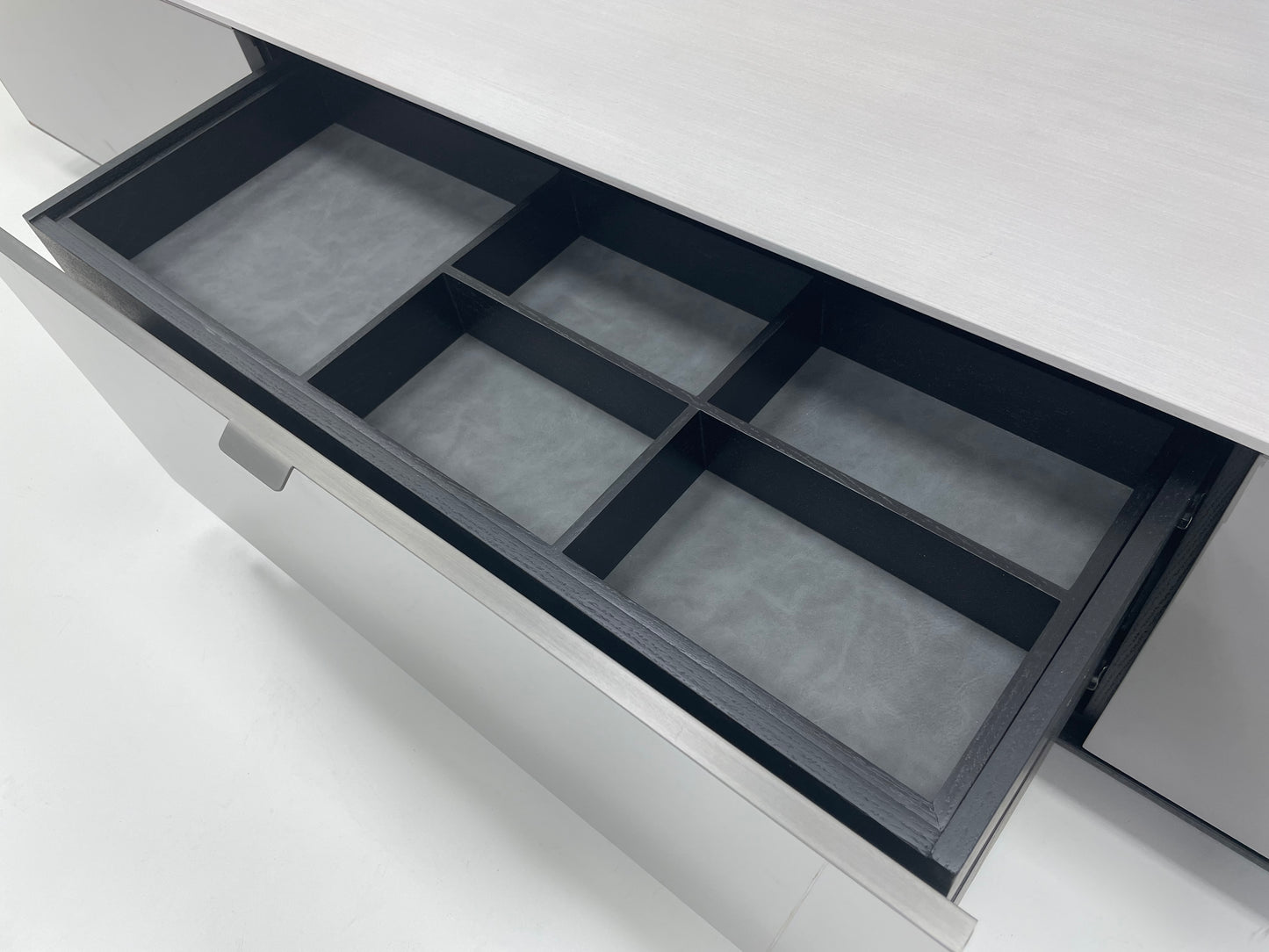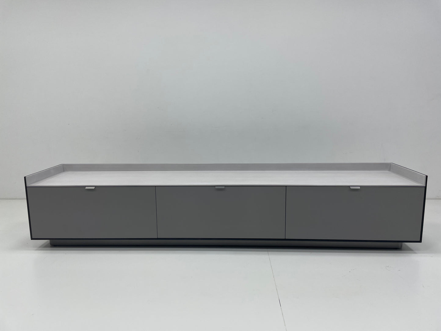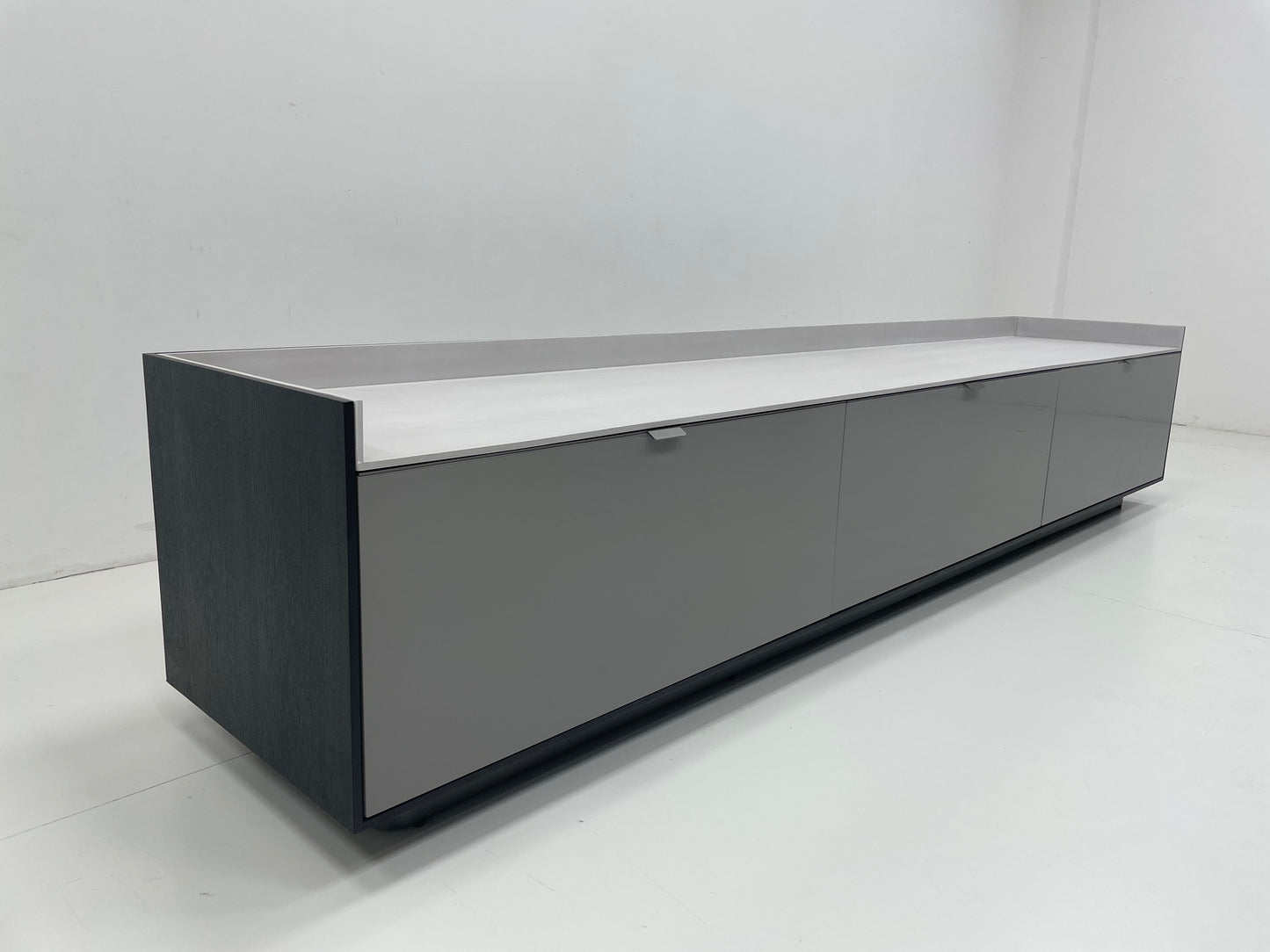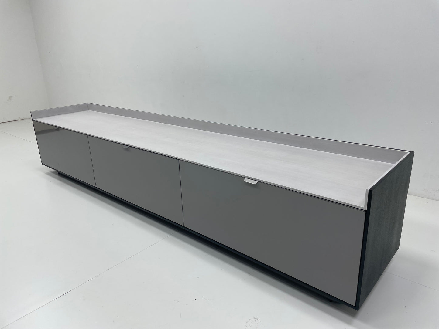 Description | The apparent formal simplicity of Darren and its rational, accurate design conceal a piece that is far more complicated and intricately structured than meets the eye. The central element in Moka-coloured ash wood features a shelf closed in on three sides, lined with Malt-coloured satin finish aluminium strips, and stands on a base in the same finish.The glossy Clay-, Sand- and Corten-coloured painted doors are opened with a handle in metal to match the top of the unit, fashioned out of the strip used to finishes their top edge. |