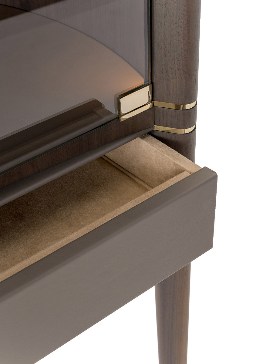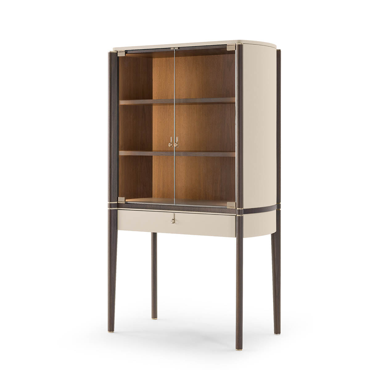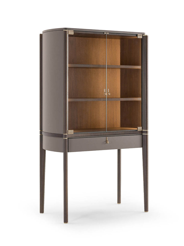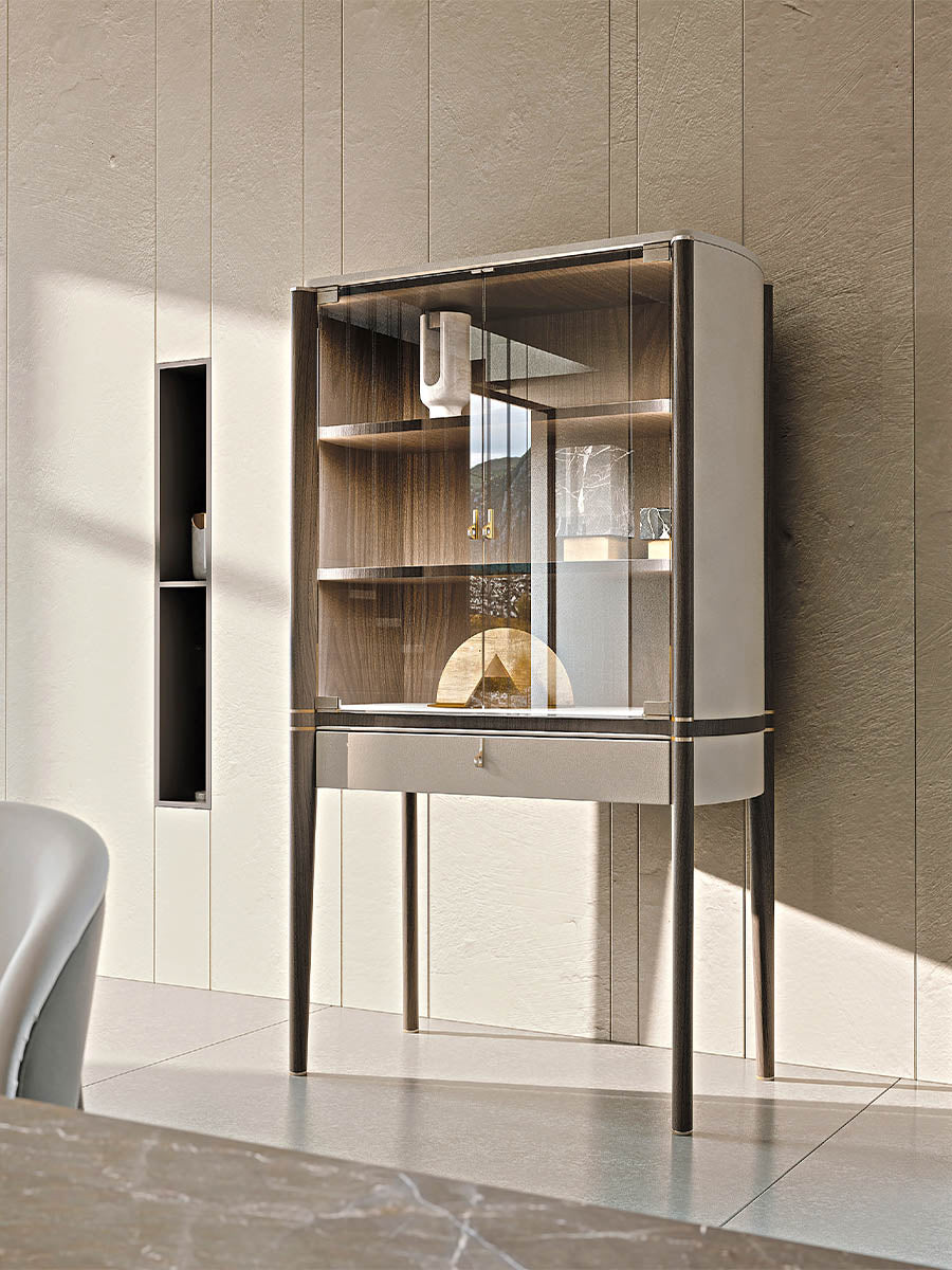 description | The vitrine of the Pinnacle collection has steep features softened by softer and more circular lines as in the curved sides. The metal details are like small points of light that highlight the shapes. Designed to store accessories and precious objects, it is equipped with wooden shelves and glass doors with internal LED lighting. |