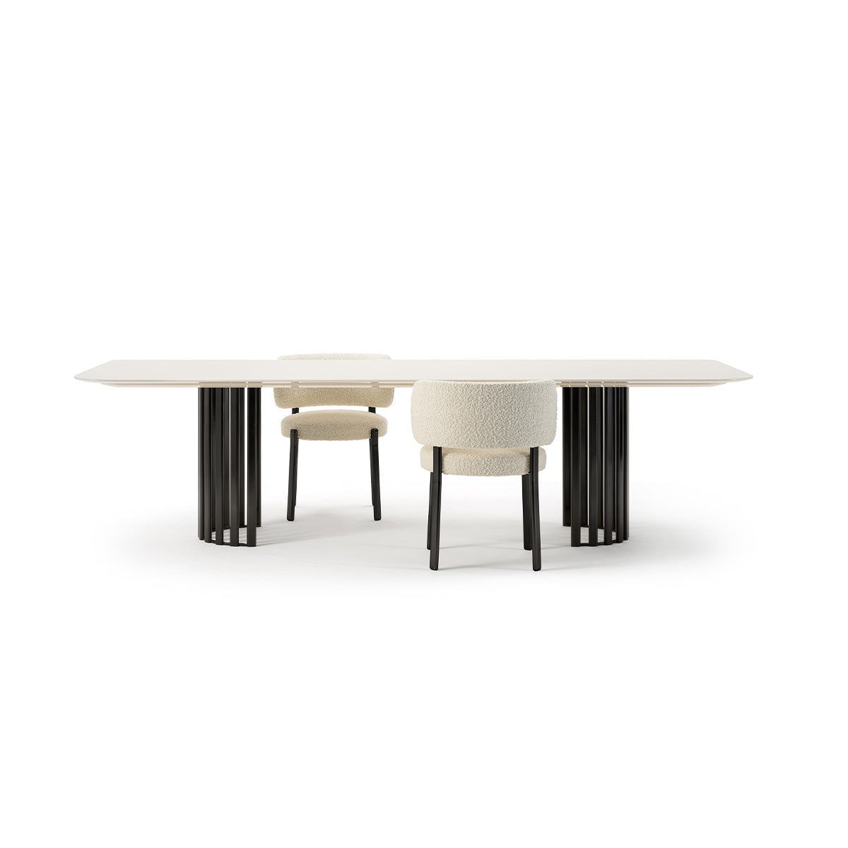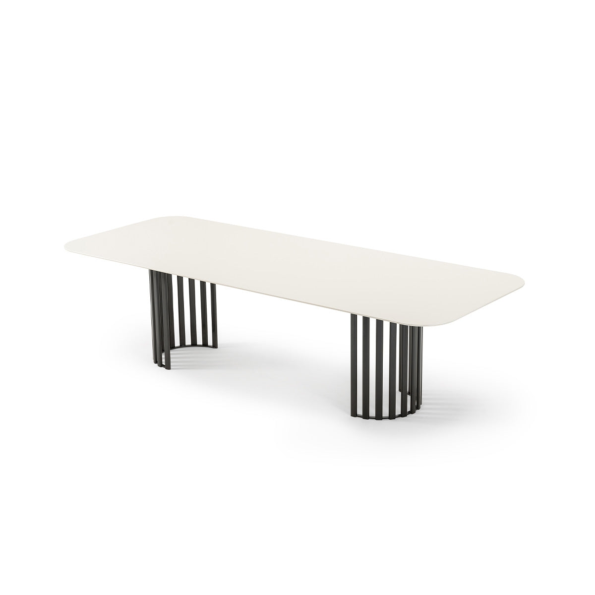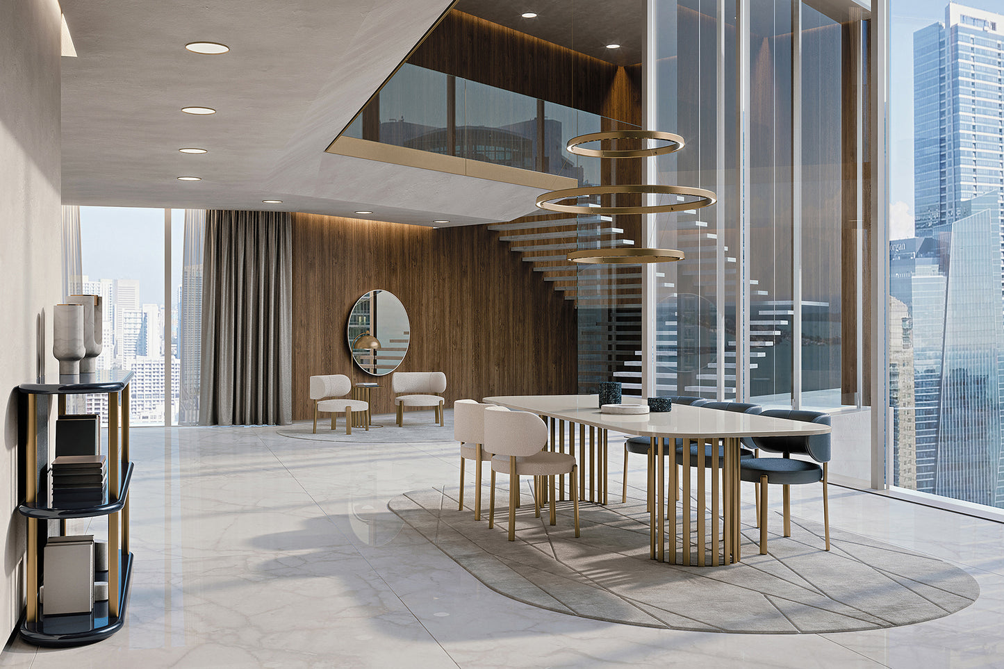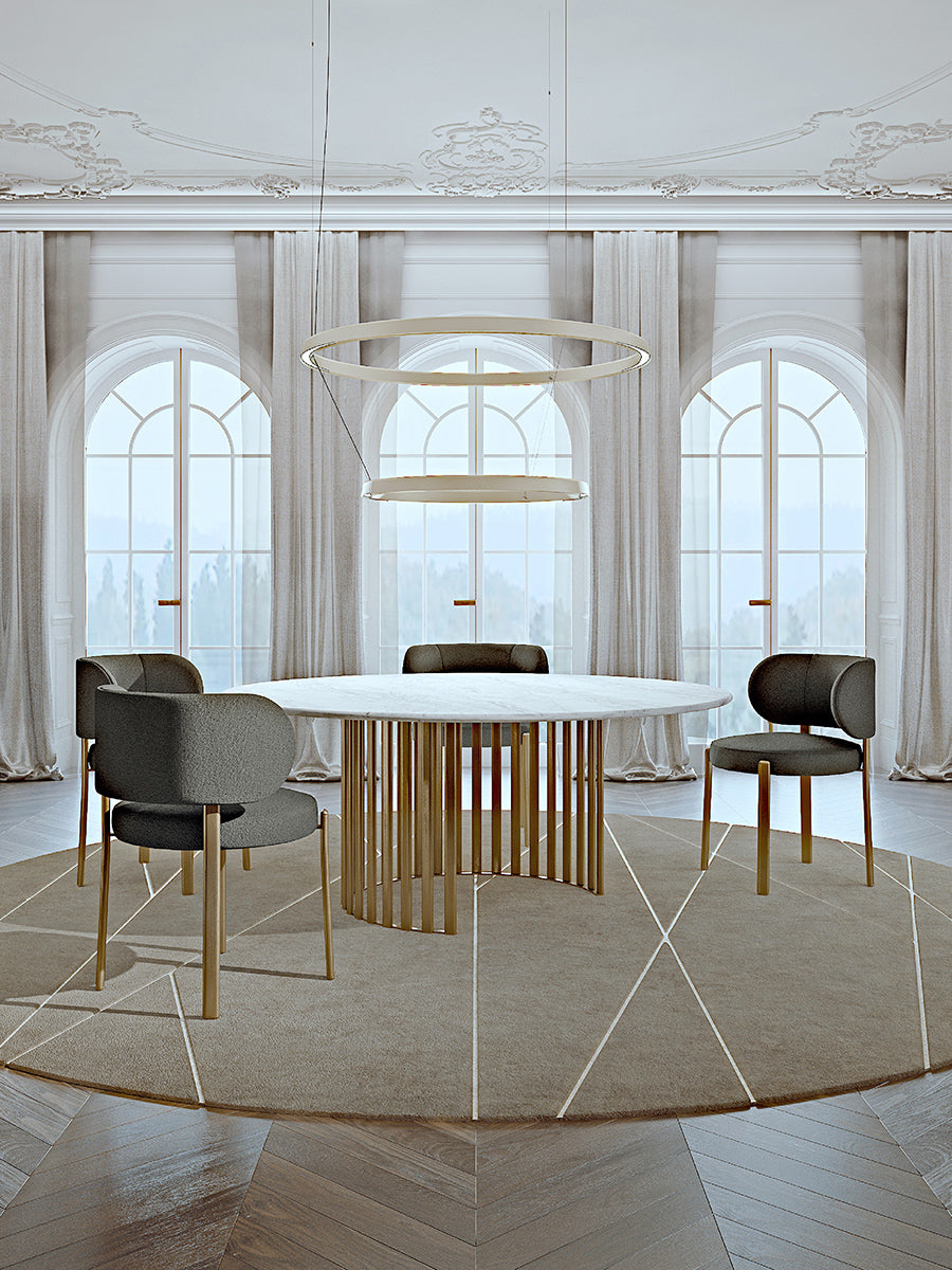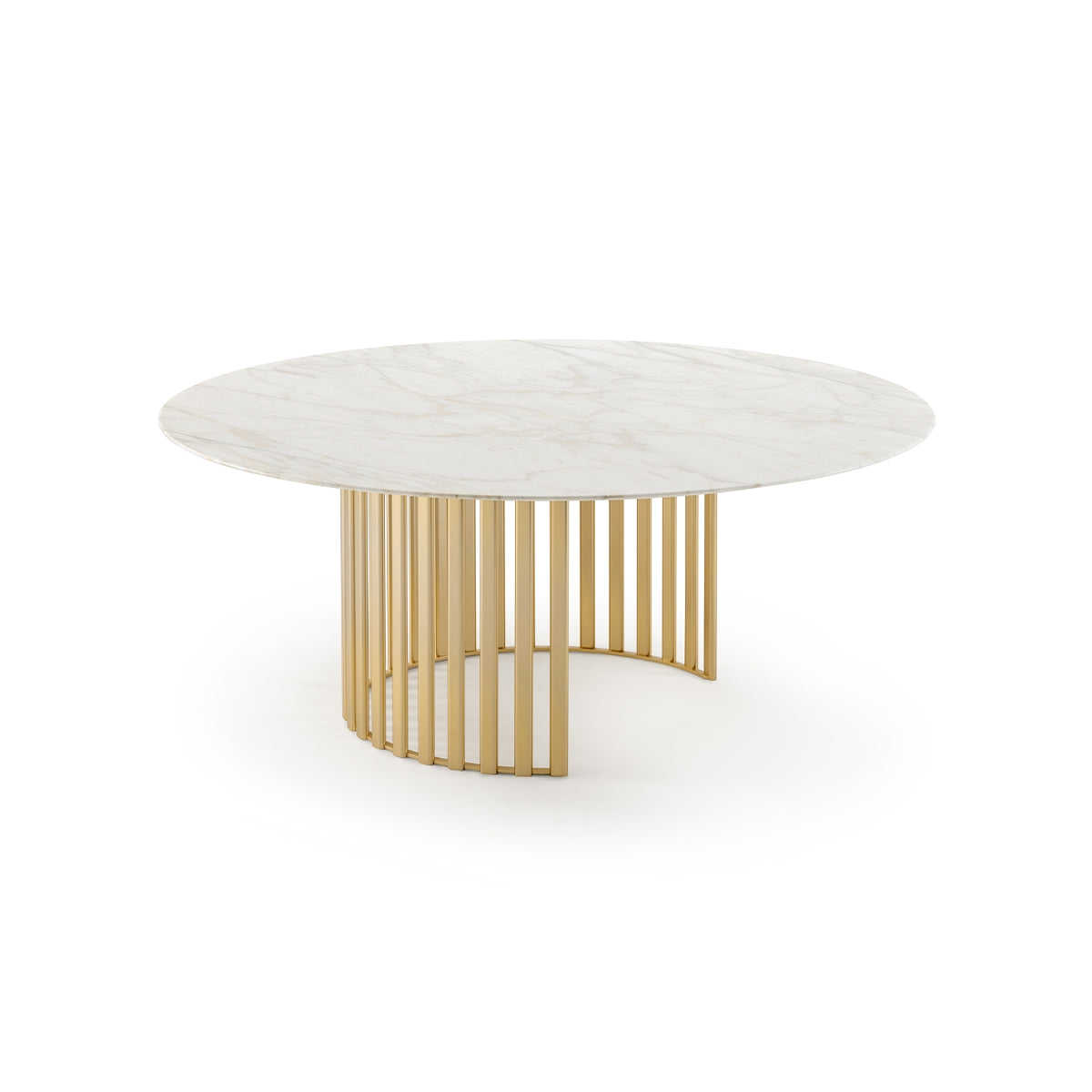 description | The Roma round table confirms the circular thinking of the entire collection in the presence of the legs and the top and is characterized by a singular metal base composed of vertical tubulars (available in the Champagne Gold and Graphite Gray finishes), with a round top in single-color lacquered marble or wood. |