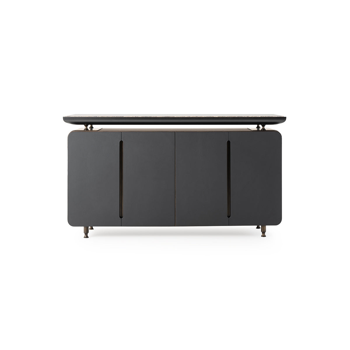 description | From the minimal line, the Silhouette sideboard, with four hinged doors in heat-treated eucalyptus covered in leather on the front and, inside two compartments with two shelves. The upper compartment is in matt black lacquer while the embedded shelf is in brown Emperador marble. The structure is raised from the ground with bronze-colored metal feet. |