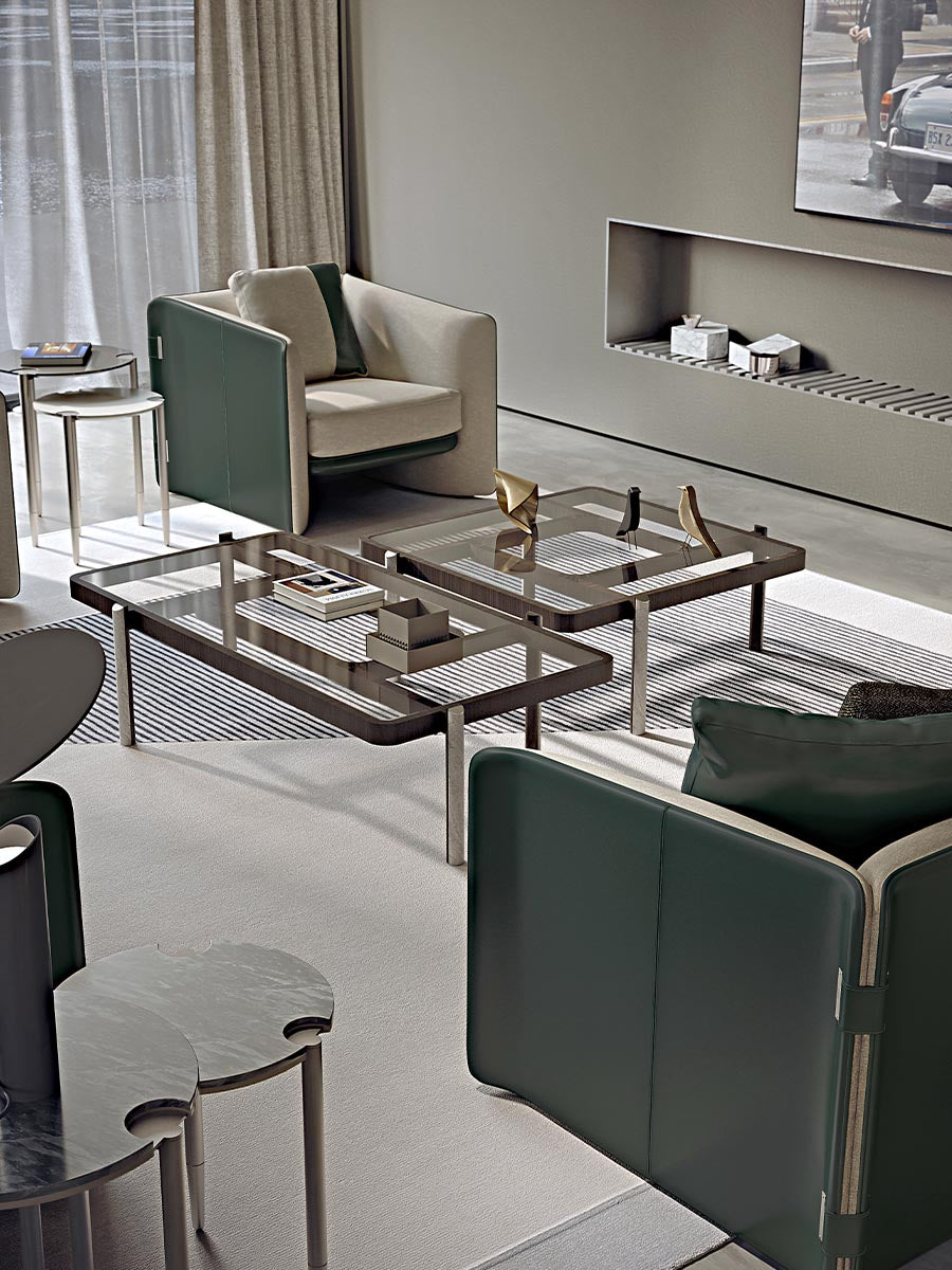 description | The coffee tables of the Vision collection express a sense of lightness and suspension. The thin wooden feet, with marble applications, support the structure on which a transparent or bronzed glass top rests. The tables are made in different sizes and available in different finishes as per sample card. |