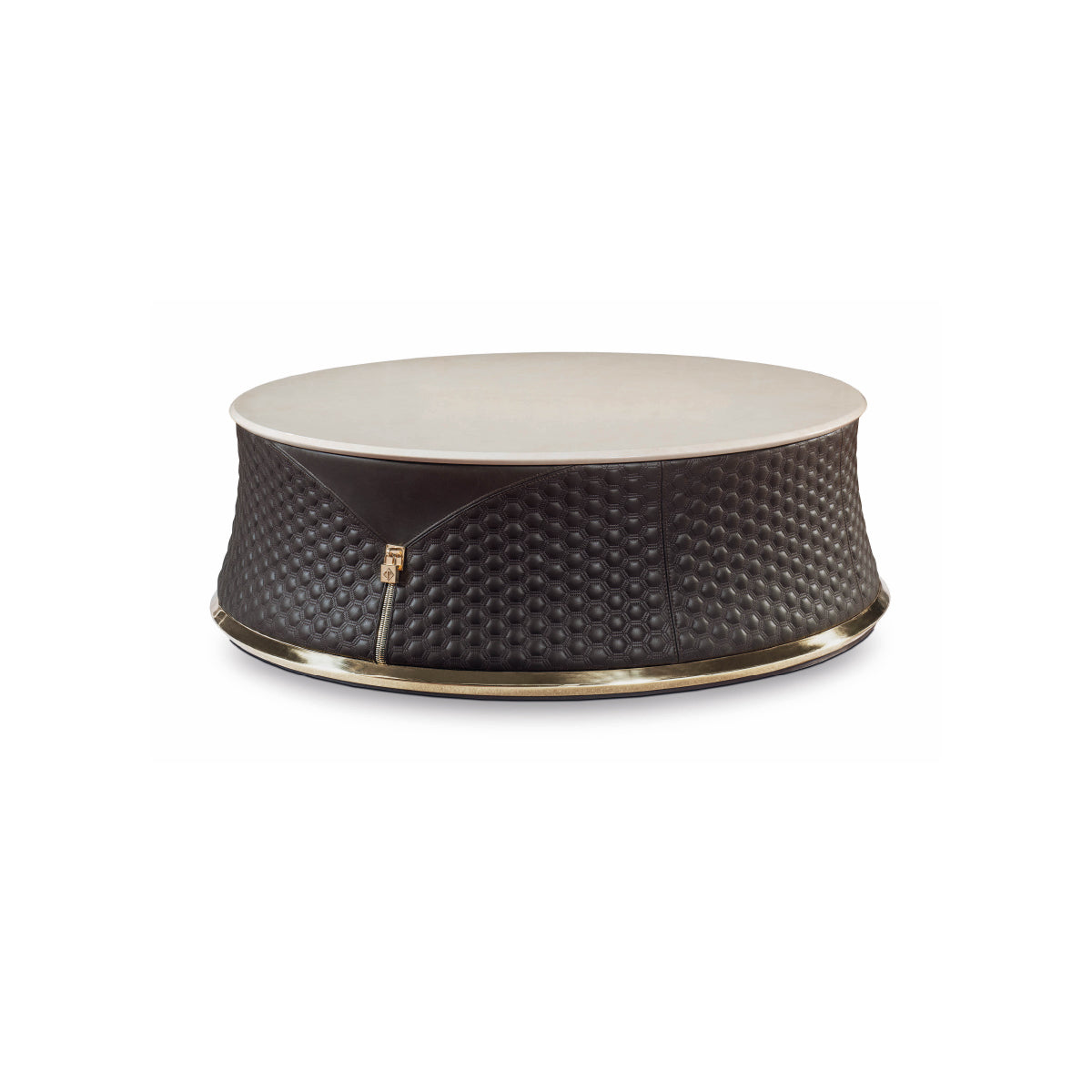 description | Coffee table from Vogue collection is distinguished by refined and sophisticated details that highlight the exclusivity of the shape, the lightly flared structure is covered with embroidered leather with application of decorative zip in gold metal and a basement in gold metal characterized by his diamond shape. Top can be chosen between marble and glossy lacquered wood. Vogue coffee table is available in two dimensions. |